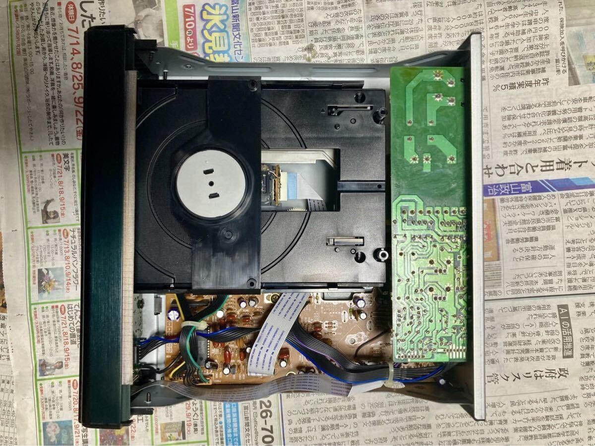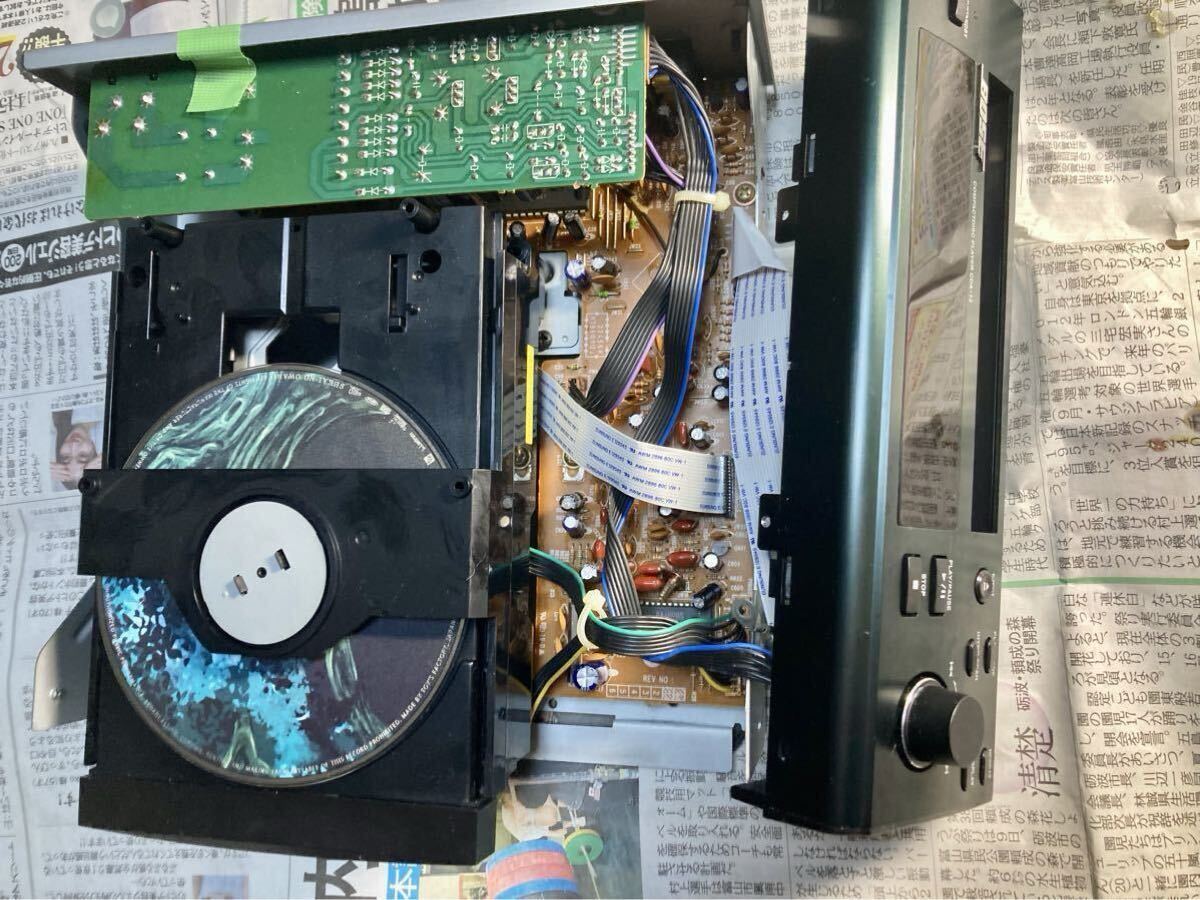 CDは再生不可、押しボタンは反応なし、選曲ツマミのロータリーエンコーダーは誤動作等の不具合がありましたが、内部基板を清掃後、分解して点検、修理しました。