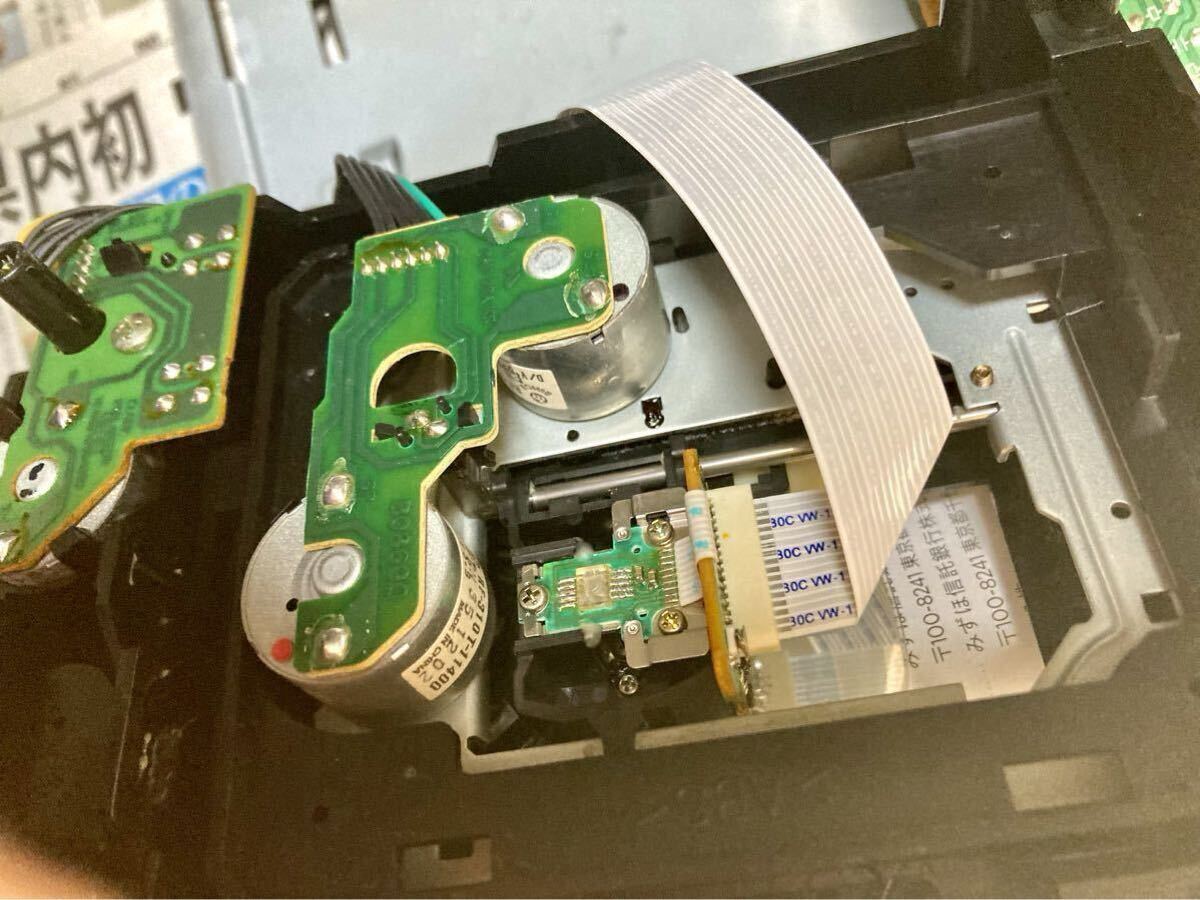 CDトレイの開閉用のゴムベルトが溶けて、プーリーの中でベトベトになっていました。アルコールで丁寧に溶けたゴムベルトを取り除き、新しいゴムベルトに交換しました。CDトレーの開閉は良好です。