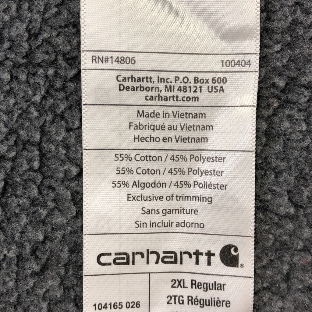 【商品管理番号】 T0490 【ブランド】 Carhartt/カーハート 【サイズ】 2XL 【実寸サイズ】 肩幅:約59cm 着丈:約77cm 身幅:約74cm 袖丈:約67cm 【主な素材】 表地 : コットン 【色】 グレー 【仕様】 大きいサイズ 55203 【状態】 汚れ:首元、袖先、腹部 特記事項:毛玉、首元ヨレ、袖ヨレ |