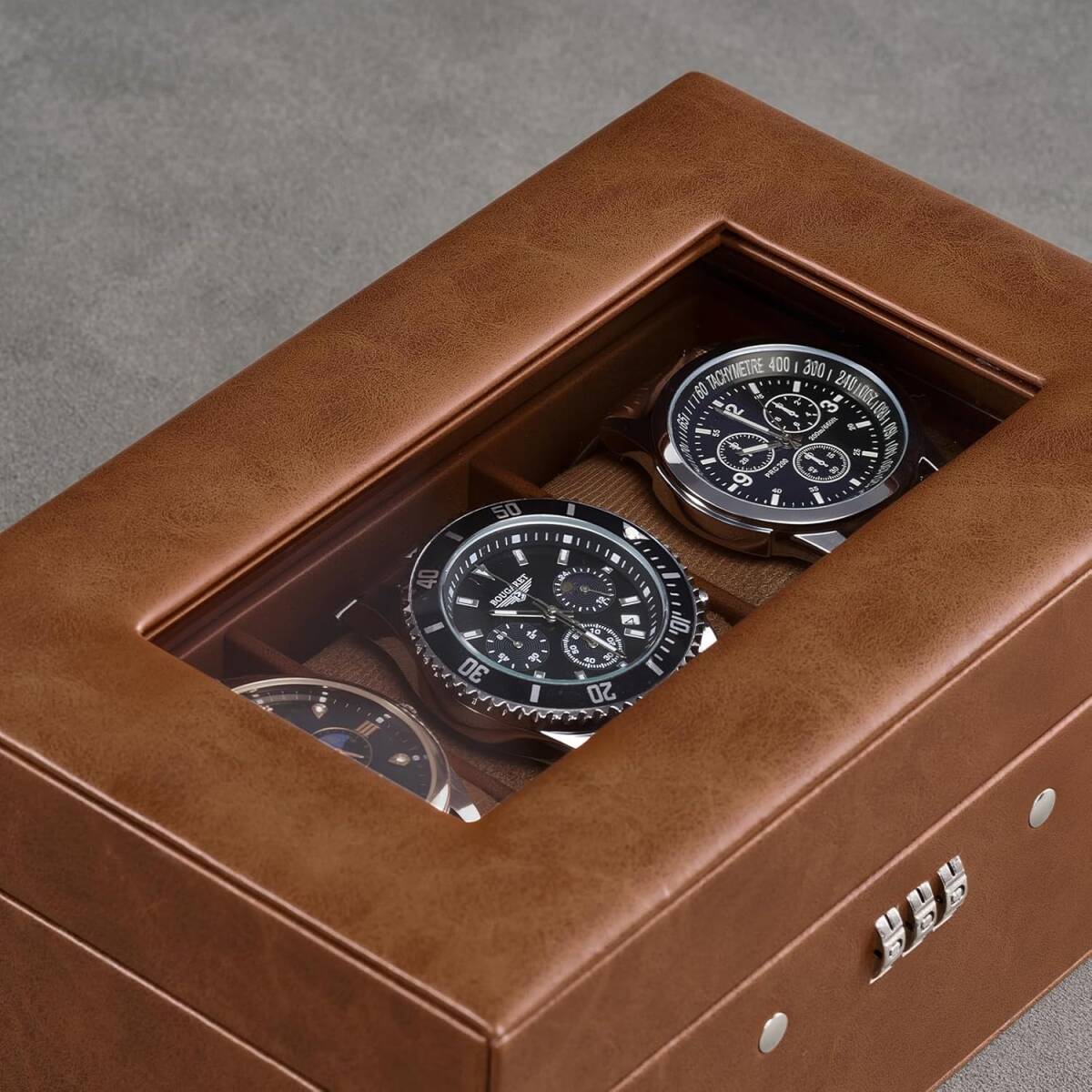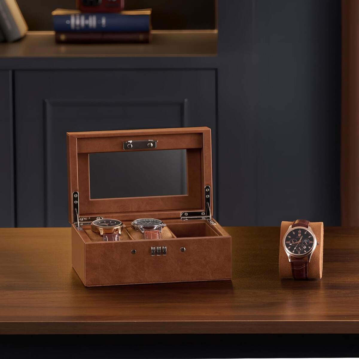 このケースを手にすると、大切な3本の時計を安全に保管しながら、インテリアの一部として楽しめます。