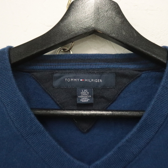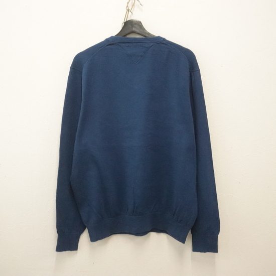 d944 2000年代製 トミーヒルフィガー コットンニットセーター■00s 表記Lサイズ ネイビー Vネック ワンポイントロゴ アメカジ 古着