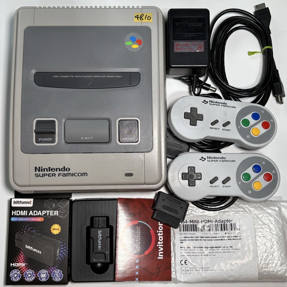 内容物はスーパーファミコン本体、コントローラー2個、電源アダプタ、HDMI変換アダプタ(新品)、HDMIケーブル【※ソフトは付属しません】