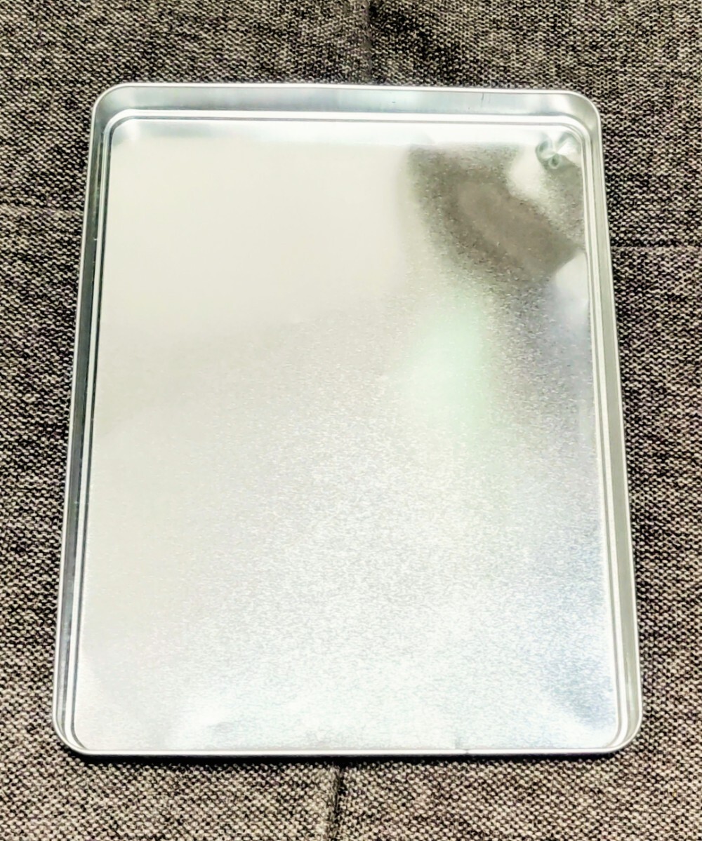 画像8、9枚目の右上、シルバーに黒っぽいものが映っていますが部屋のものがシルバー面に反射して映っています。缶、蓋の内側は全体的にシルバーです。