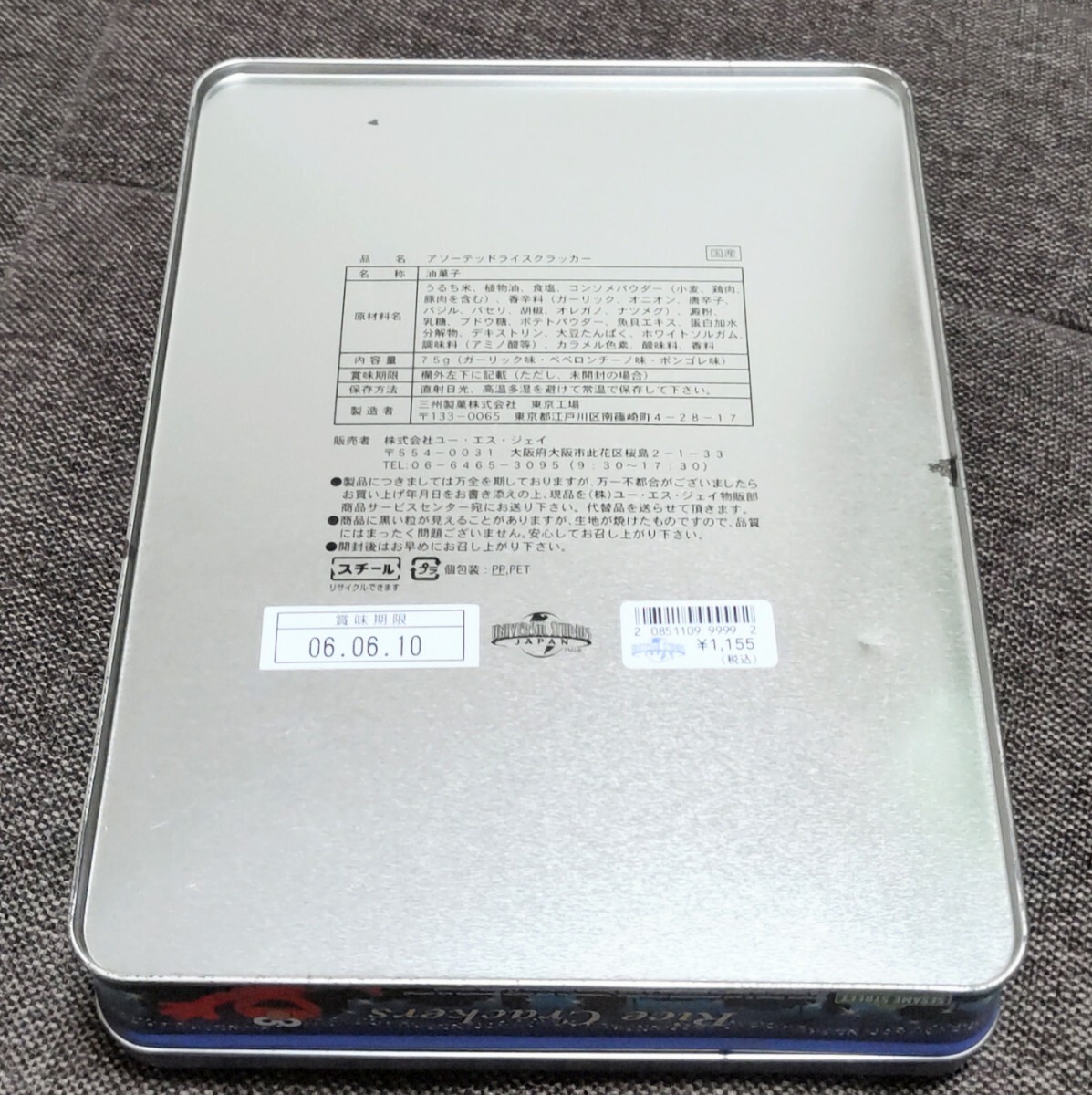紺色のスチール缶 お土産 ライスクラッカー ユニバーサル・スタジオ・ジャパン 中身なし