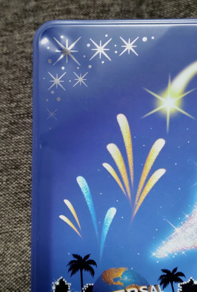 USJに行った時に購入。ライスクラッカーが入っていました。中身を出してから自宅にて保管していましたが何度か開けたり閉めたりしていたので少々へこみ、スリキズ等あります。