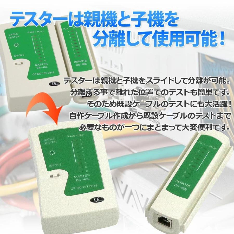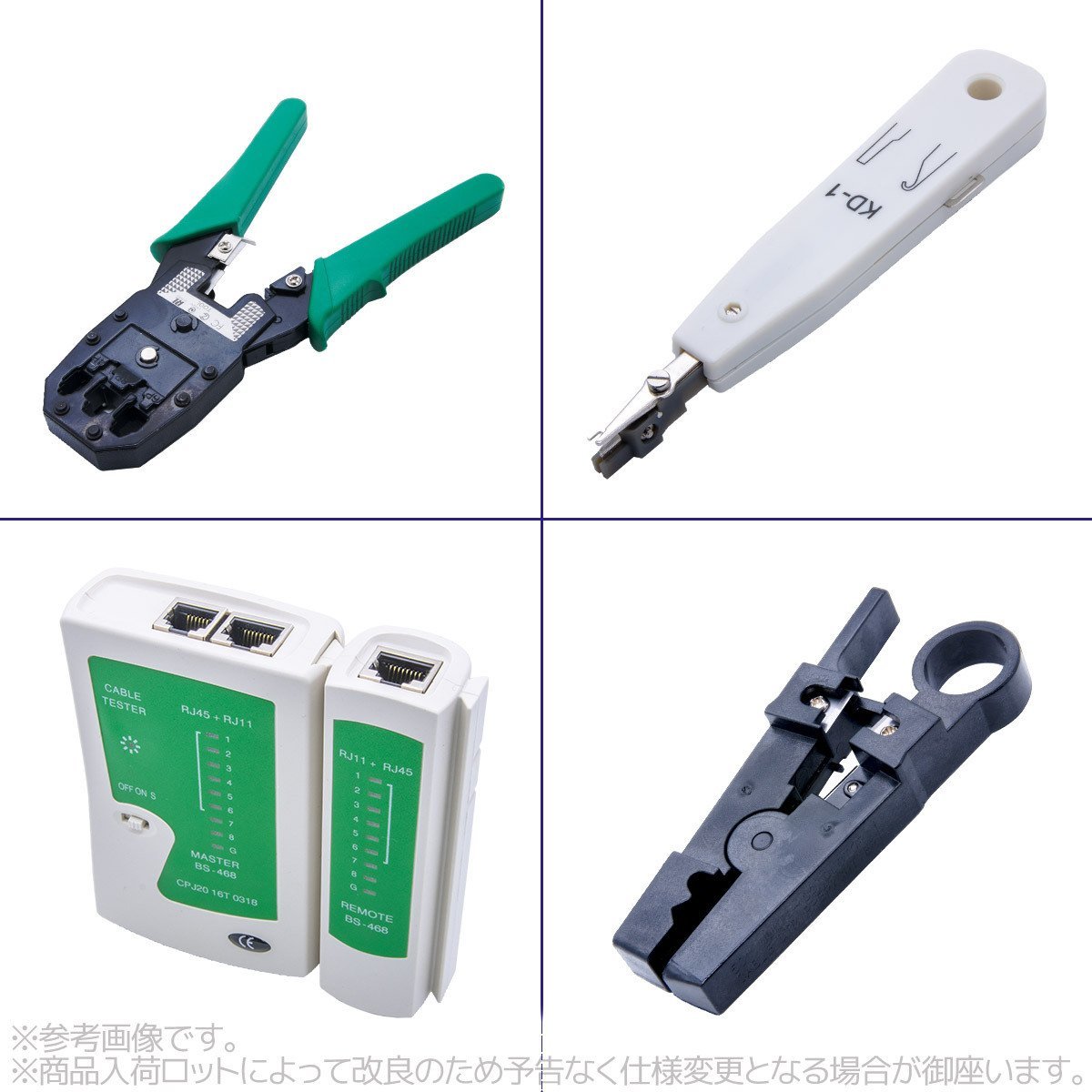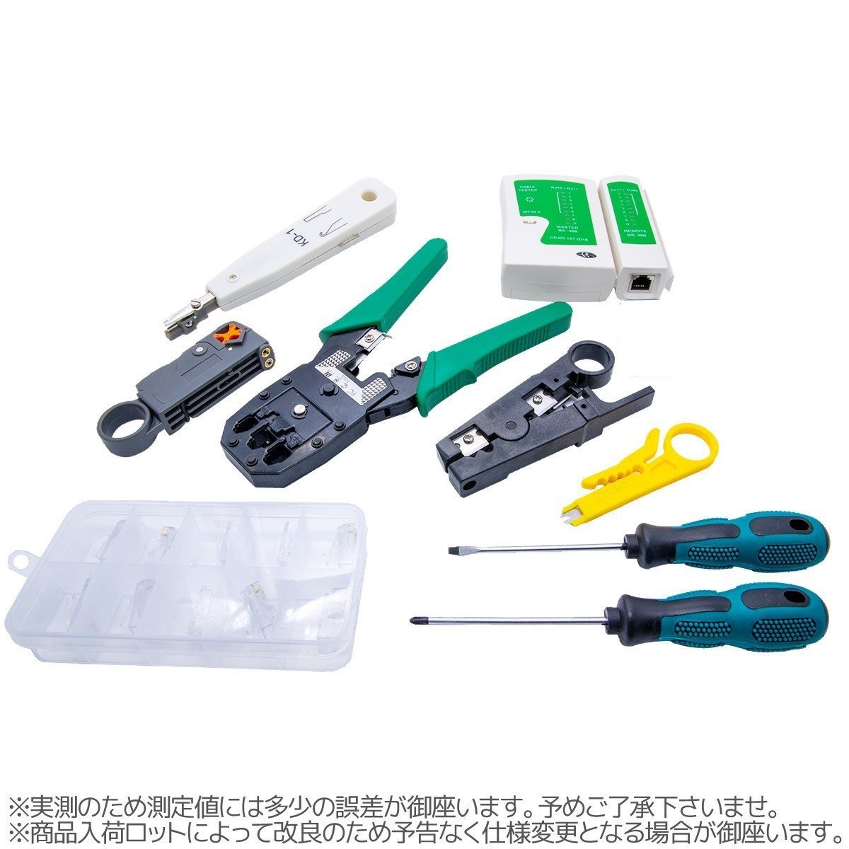 | 商品の詳細 | ★★多機能LANケーブル修理ツールセットです。 【商品仕様】 ネットワークケーブル 電話LANケーブル修理など圧着ペンチ 皮むきに大活躍! 工具が一式揃っているので、LANケーブルを自作することができます。 ケーブル作成後、問題がないかをテスターにて診断します。便利なセットです。 圧着工具は4極、6極、8極のモジュラープラグに対応しています。 | |
