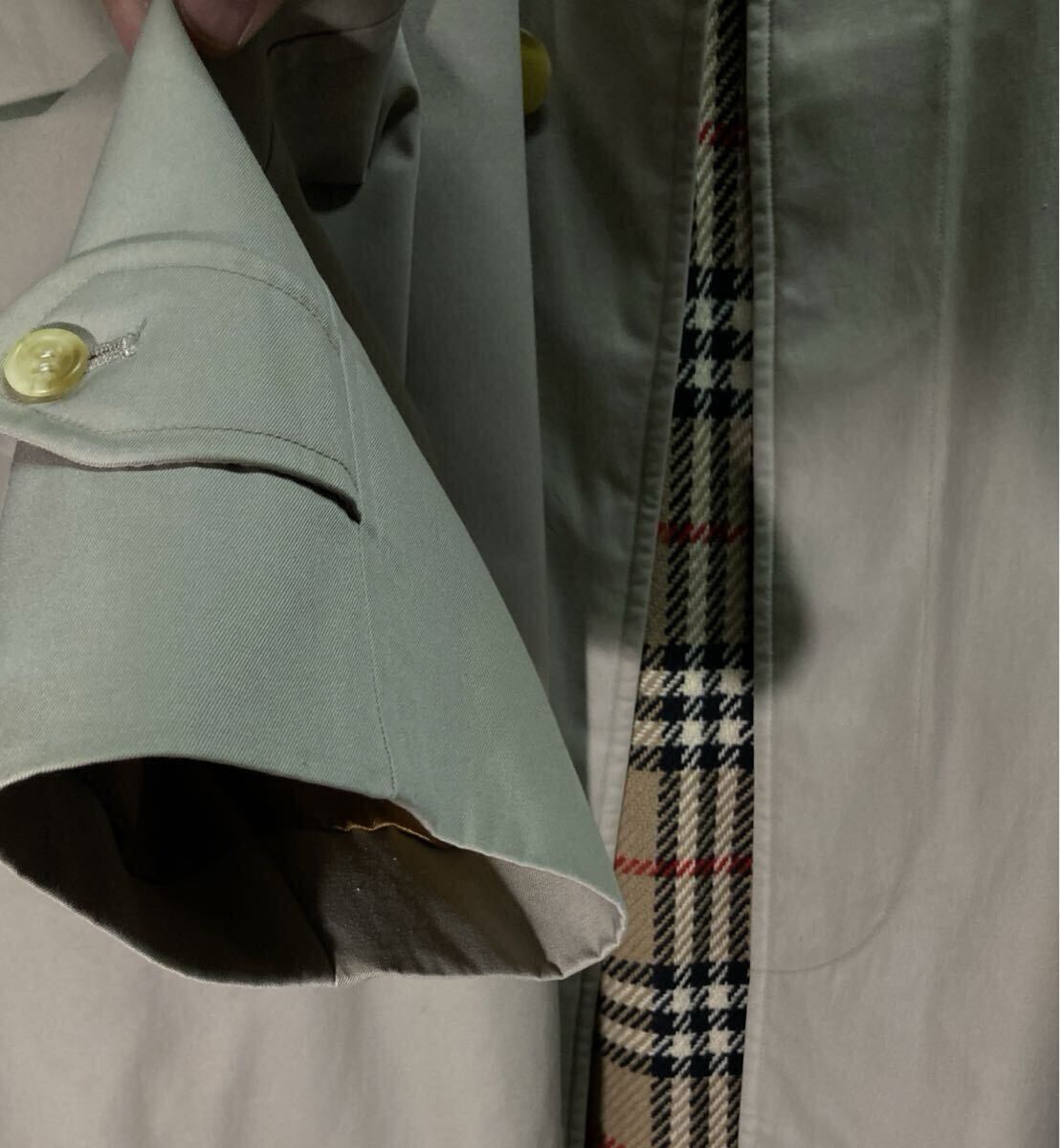 全体的的には多少のスレがありますが比較的きれいかと思います。コートの後ろの一部に茶色の汚れのようなものがございます。コートのサイドのタグに名前が刺繍されております。