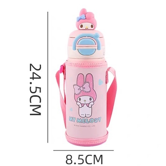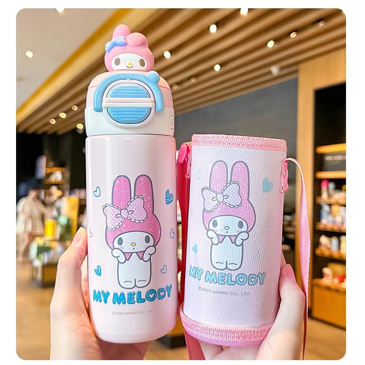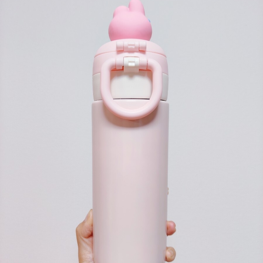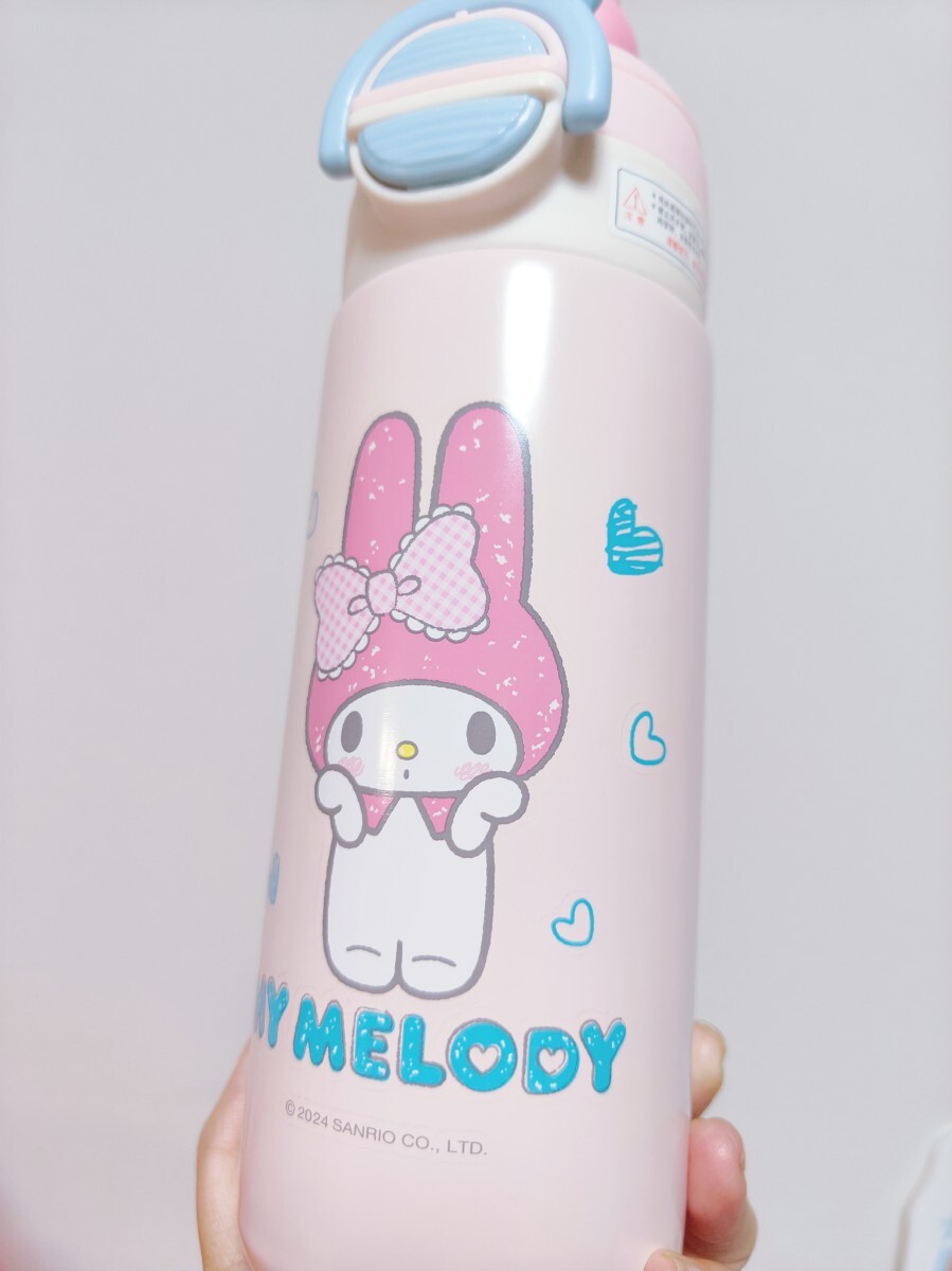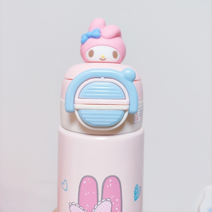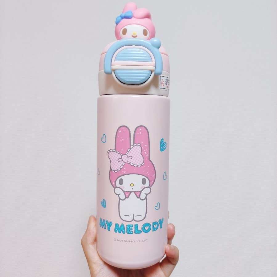 サンリオマイメロディデザインのピンクのステンレス水筒、専用ケース付き。