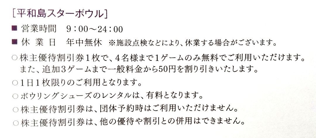 平和島スターボウル ボウリング 1ゲーム 無料券 2枚セット有効期限:2025年12月31日一般基本料金、平日 700円、土日・祝日 800円のため、大変お得にボウリングがプレイできます。