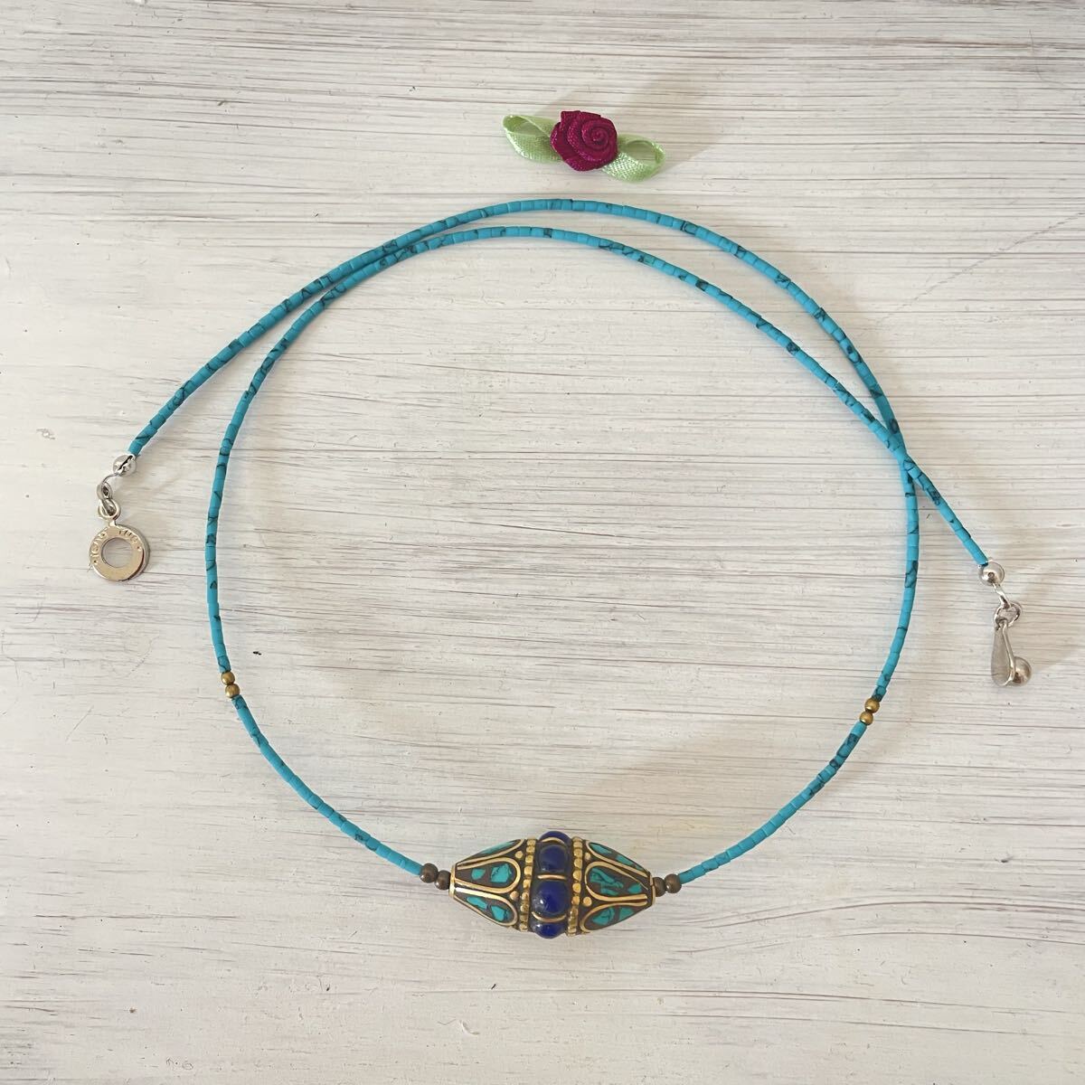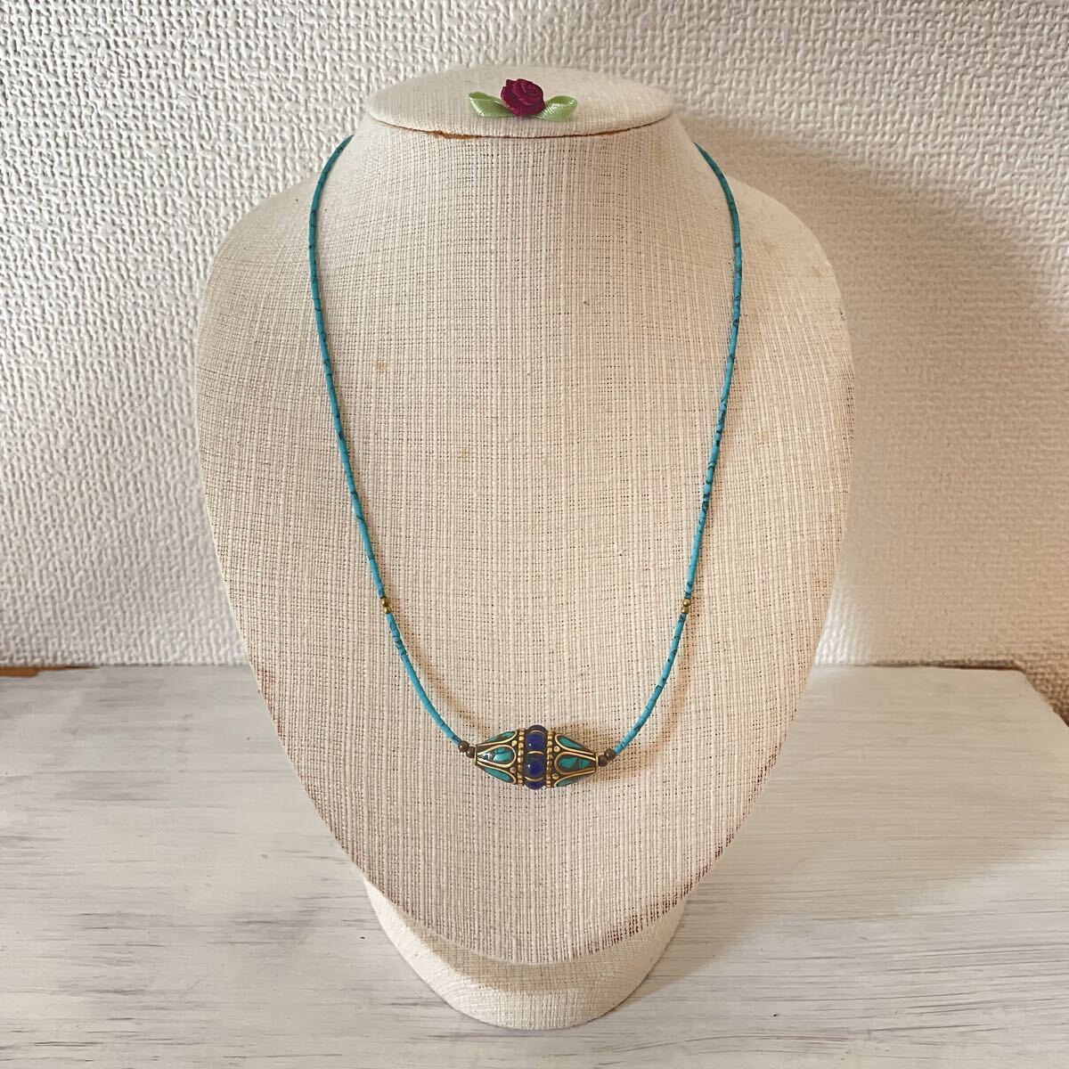 エレガントなネパールの伝統工芸を用いたトップとターコイズブルーがとってもマッチしてセレブ感を上手く演出しているネックレスです。