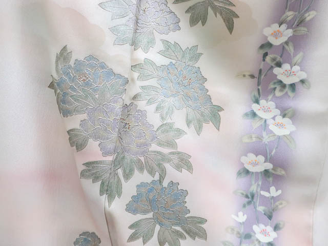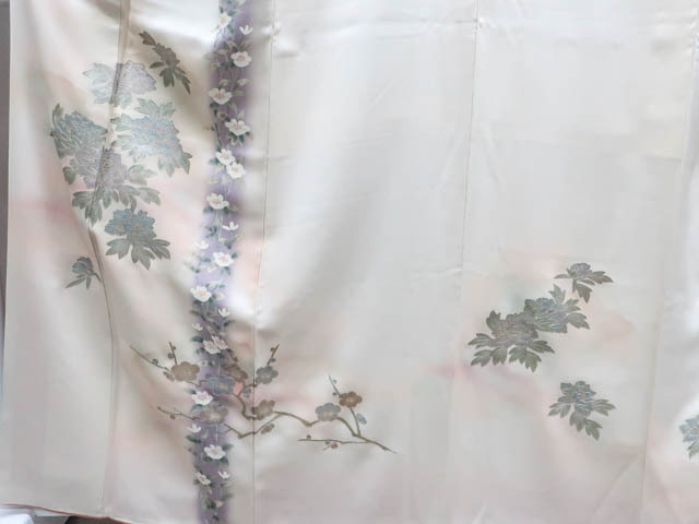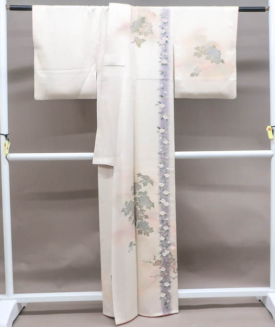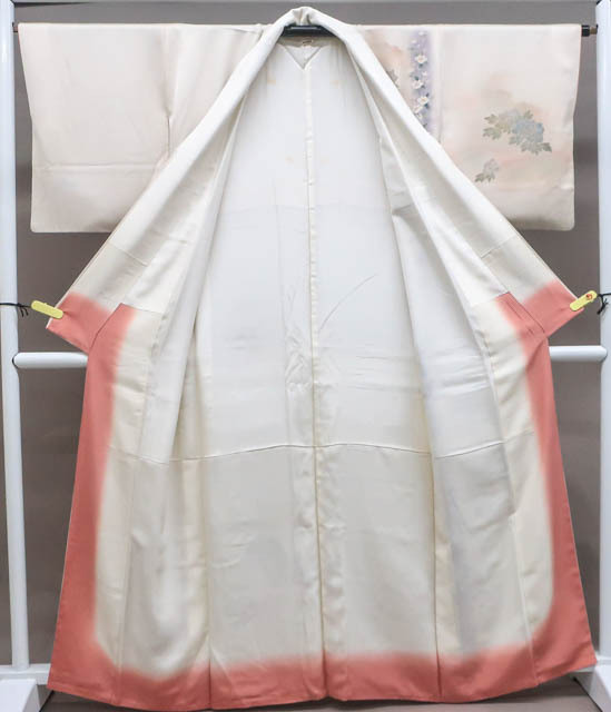 リサイクル商品のため、胴裏・背・衿袖など全体の所々シミがございますがご着用いただけると存じます。 地色はピンクみのある生成りです。 1枚目の画像が近いお色かと思われます。 素材は正絹です。 |