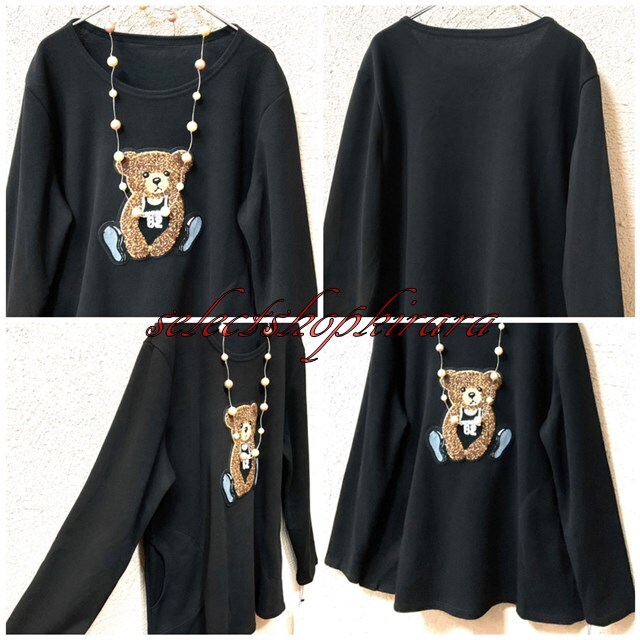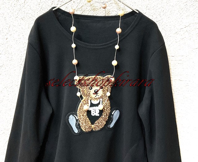 ◎クマちゃんのアップリケ刺繍がとっても可愛くて目を惹くストレッチカットソーです。適度な生地厚、伸縮性もあるのでとても着やすいです。ウエスト辺り両サイドに浅めではありますがポケットも付いています。広がり過ぎないAラインも◎です。