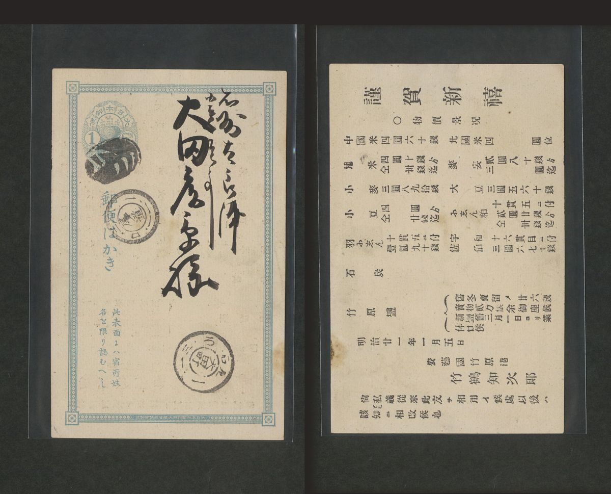 葉書 使用済 ボタ印 小判 尾道ボタ 二重丸型日付印21.1.11.ロ 二重丸型日付印大田町