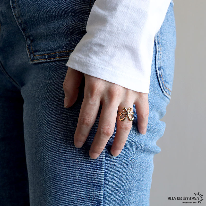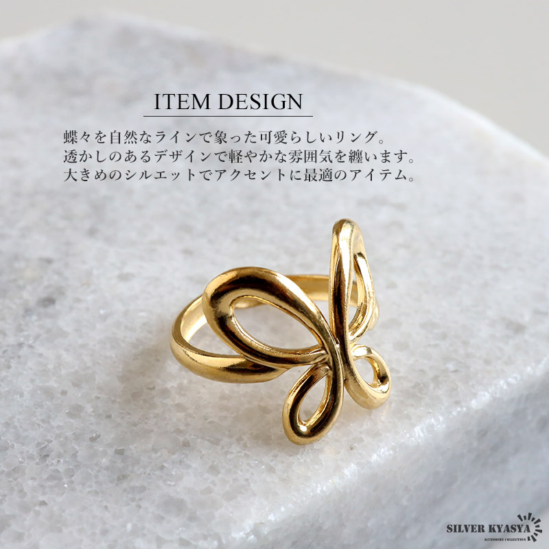 蝶々を自然なラインで象った可愛らしいリング。透かしのあるデザインで軽やかな雰囲気を纏います。大きめのシルエットでアクセントに最適のアイテム。