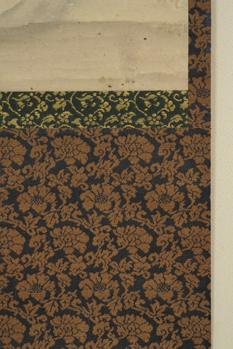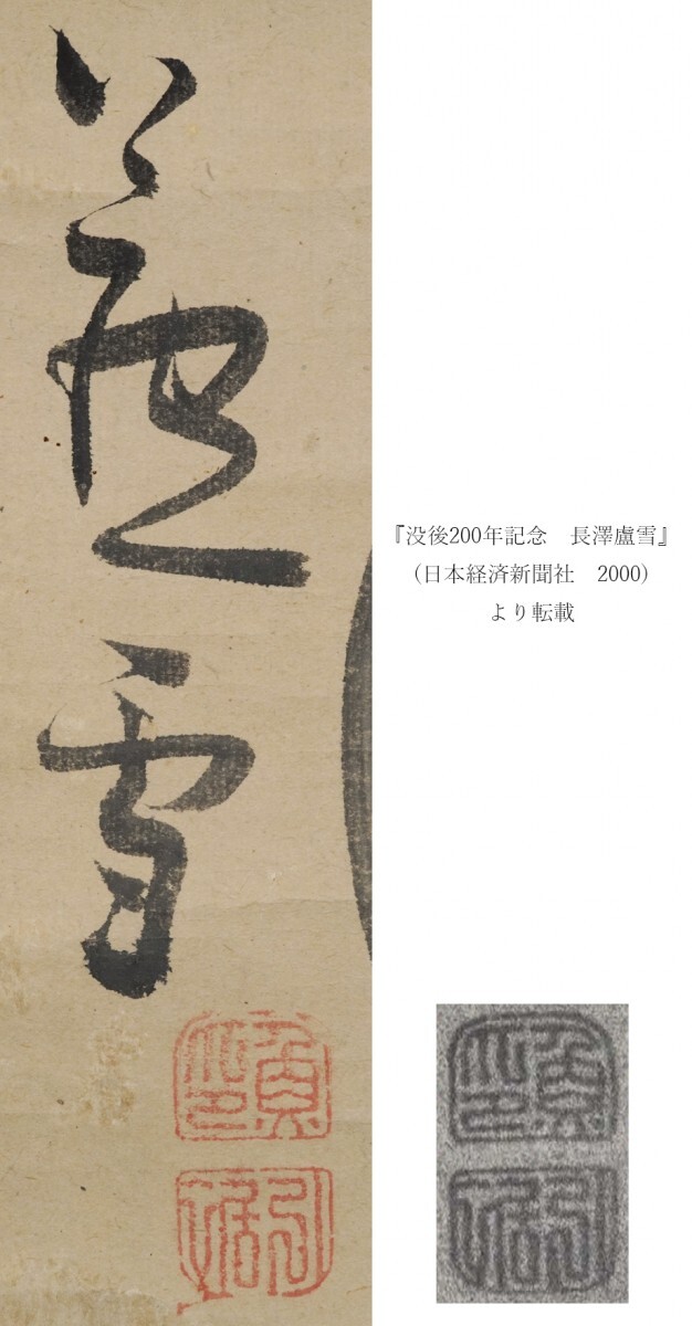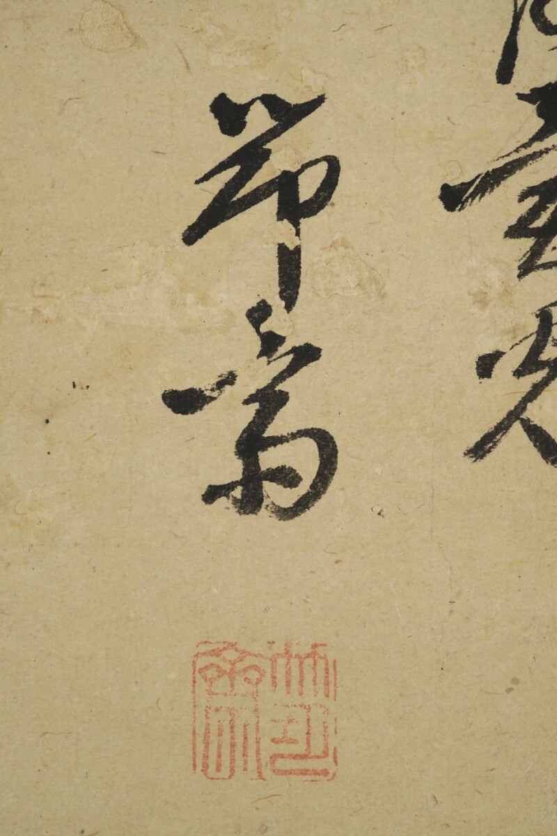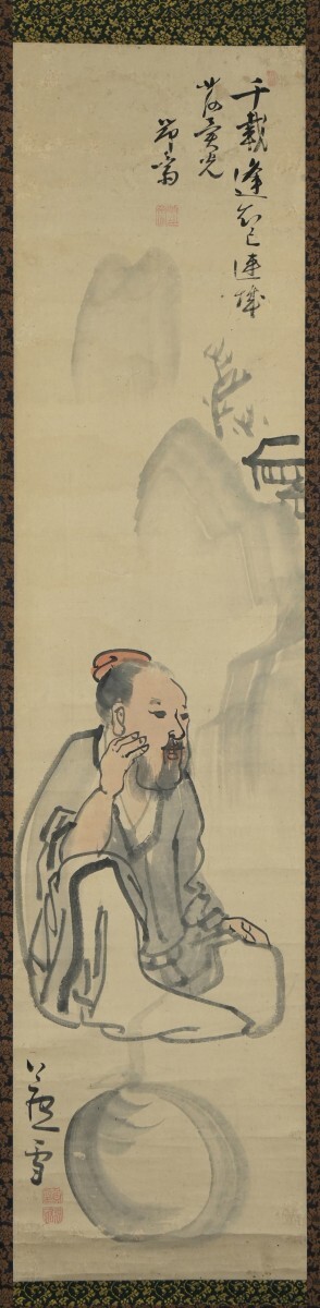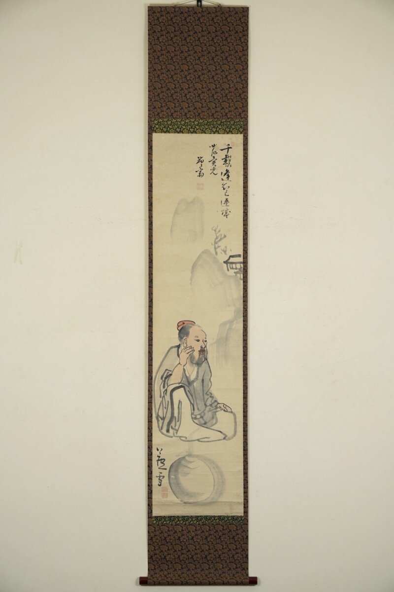 総丈サイズ…横 31 × 縦 179.5 cm 紙本着色・箱入 祇園千枚 状態…本紙少オレ・少傷ミ 【印刷ではありません】 【真作】 長沢芦雪 江戸中期の絵師。山城国淀生。名は政勝・魚、字は氷計・引裾、通称は主計、別号に干洲漁者・干緝。円山応挙の門下に入るが、幾度となく破門されたとの説も残る。しかし応挙はその才も認めており、天明6年和歌山県無量寺の落成にあたり、親しい住職に記念の作を届けるため芦雪を大抜擢したという。芦雪はそこで自身の才能をいかんなく発揮、串本に多くの作品を残した。画風は自由奔放、奇抜そのもので、同時代の曽我蕭白、伊藤若冲とともに「奇想派」などと言われる。寛政11年(1799)歿、45歳。 皆川淇園 江戸中期の儒学者。京都生。淇園は号で、名は愿(げん)、字は伯恭、通称は文蔵。別号に節斎・有斐斎等。易学について研究を深め、「名」と「物」との関係を解釈する開物論を唱えた。「老子」「荘子」「列子」「論語」など多くの経書に対する注釈書を著す。文化3年には学問所弘道館を開き、多くの門人を輩出。詩文や書画にも優れた風流人で、山水画は円山応挙に劣らずと評されたほどであった。応挙・呉春・岸駒・長沢蘆雪らと交わる。文化4年(1807)歿、74歳。 |