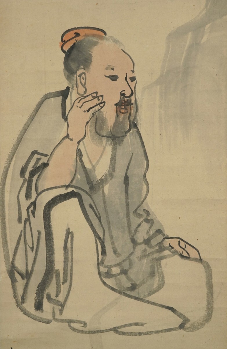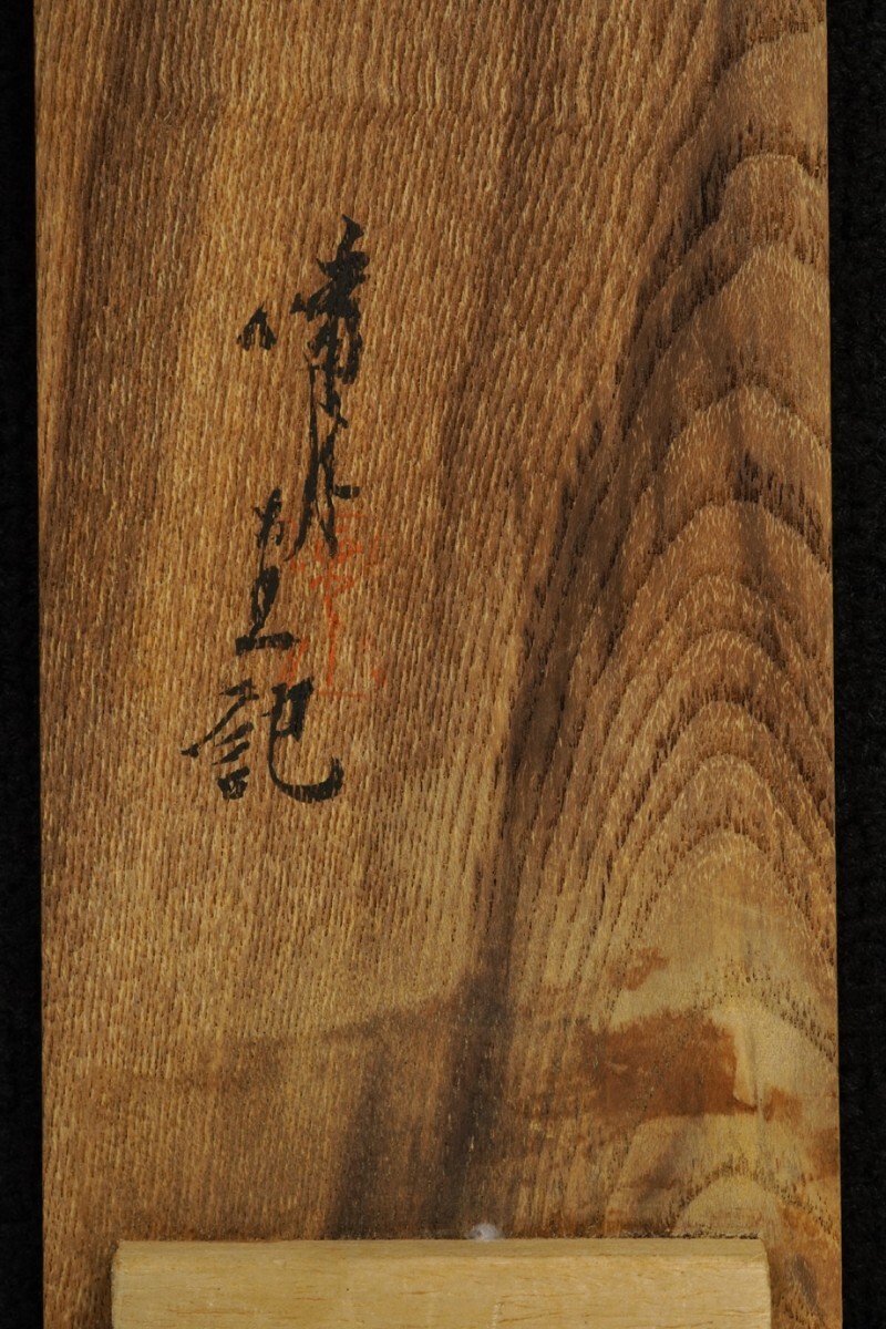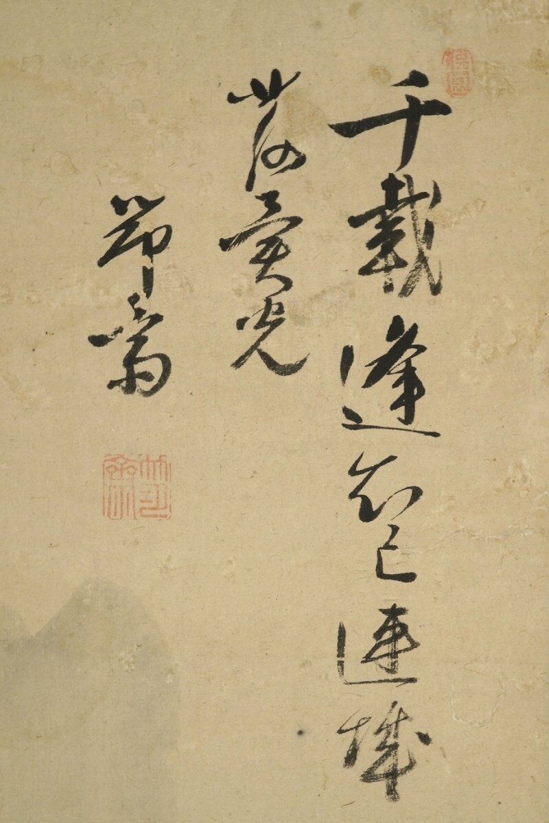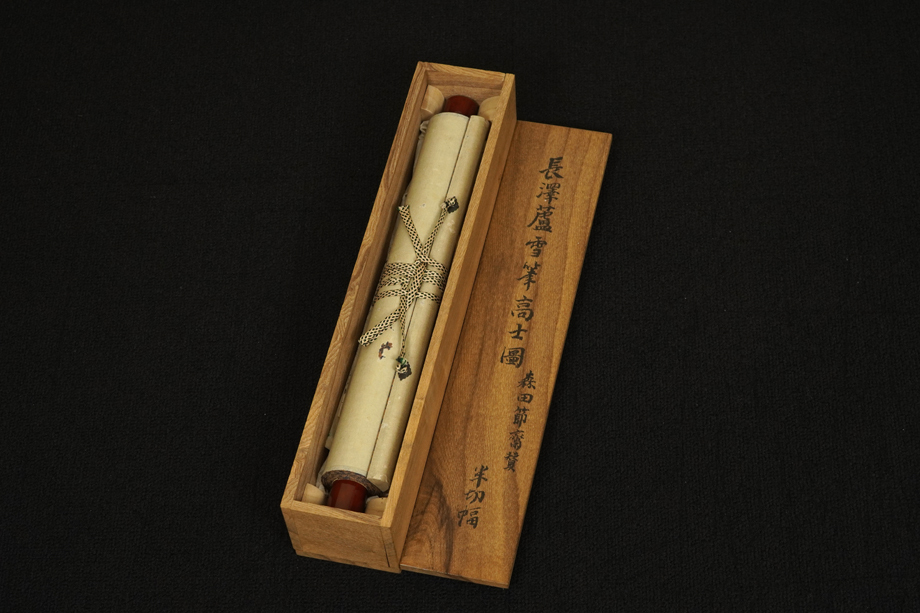 総丈サイズ…横 31 × 縦 179.5 cm 紙本着色・箱入 祇園千枚 状態…本紙少オレ・少傷ミ 【印刷ではありません】 【真作】 長沢芦雪 江戸中期の絵師。山城国淀生。名は政勝・魚、字は氷計・引裾、通称は主計、別号に干洲漁者・干緝。円山応挙の門下に入るが、幾度となく破門されたとの説も残る。しかし応挙はその才も認めており、天明6年和歌山県無量寺の落成にあたり、親しい住職に記念の作を届けるため芦雪を大抜擢したという。芦雪はそこで自身の才能をいかんなく発揮、串本に多くの作品を残した。画風は自由奔放、奇抜そのもので、同時代の曽我蕭白、伊藤若冲とともに「奇想派」などと言われる。寛政11年(1799)歿、45歳。 皆川淇園 江戸中期の儒学者。京都生。淇園は号で、名は愿(げん)、字は伯恭、通称は文蔵。別号に節斎・有斐斎等。易学について研究を深め、「名」と「物」との関係を解釈する開物論を唱えた。「老子」「荘子」「列子」「論語」など多くの経書に対する注釈書を著す。文化3年には学問所弘道館を開き、多くの門人を輩出。詩文や書画にも優れた風流人で、山水画は円山応挙に劣らずと評されたほどであった。応挙・呉春・岸駒・長沢蘆雪らと交わる。文化4年(1807)歿、74歳。 |