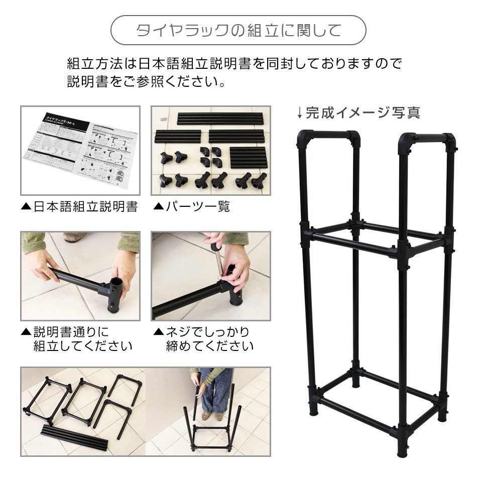 そんなときはタイヤラックですっきり収納! 上下2段にタイヤを収納することが出来るうえに、省スペースで保管が可能なので ガレージの隅や、ベランダ・倉庫にも無理なく設置できます。 軽自動車用のタイヤが1台分(4本)収納できます。 ドライバー1本で簡単組み立て!誰でも簡単にできます。 【商品仕様】 ・組み立て時サイズ (約):幅460mm×奥行320mm×高さ1040mm ・重量(約):3.5kg ・耐荷重(約):120kg ・カラー:ブラック ・材質:スチール、ステンレス他 ・適合タイヤサイズ: ・タイヤ幅 160mm以下、外径 485~550mm ・135/SR12 ・145/70R12 ・145/80R10 ・155/60R13 等 ※入荷時期により商品画像とカラーが異なる場合がございます。ご了承の上、ご落札頂きますようお願い致します。 ★★★その他 ラインナップ★★★ ・ Sサイズ(軽自動車用) ・ Mサイズ(普通車用) ・ Lサイズ(大型車用) ・ タイヤ8本収納 キャスター付 |