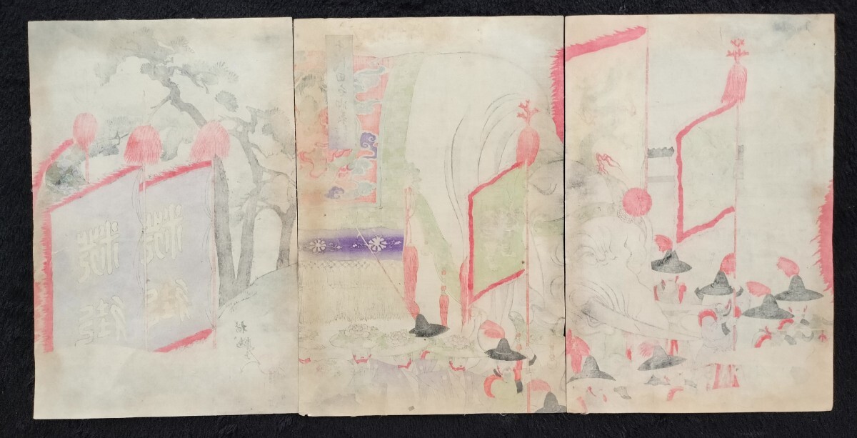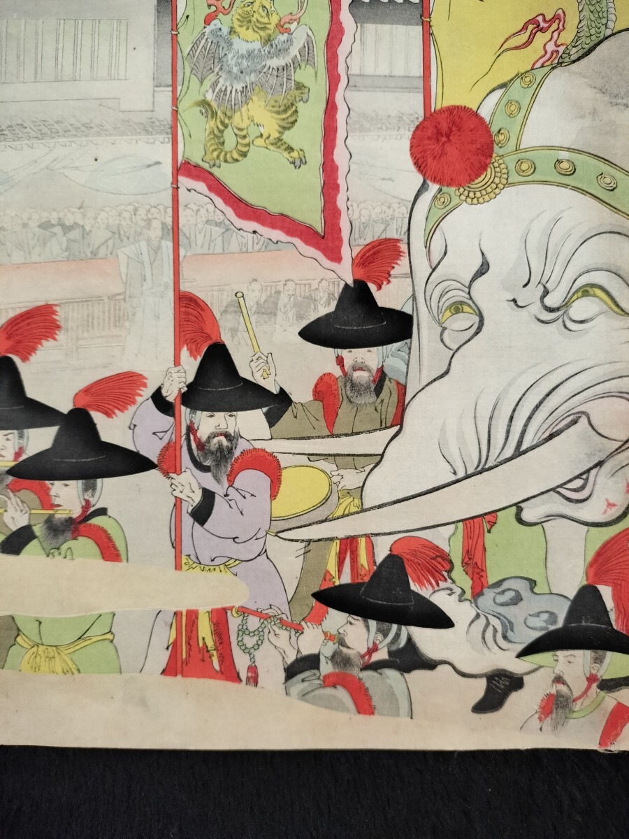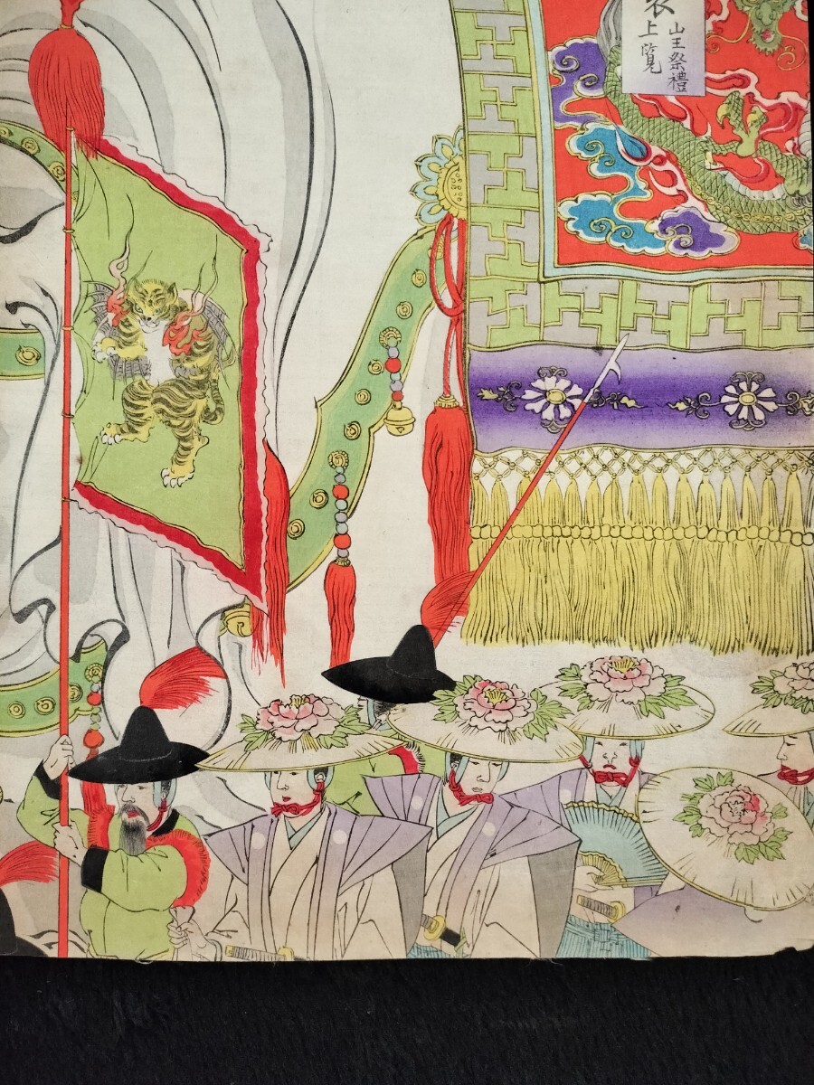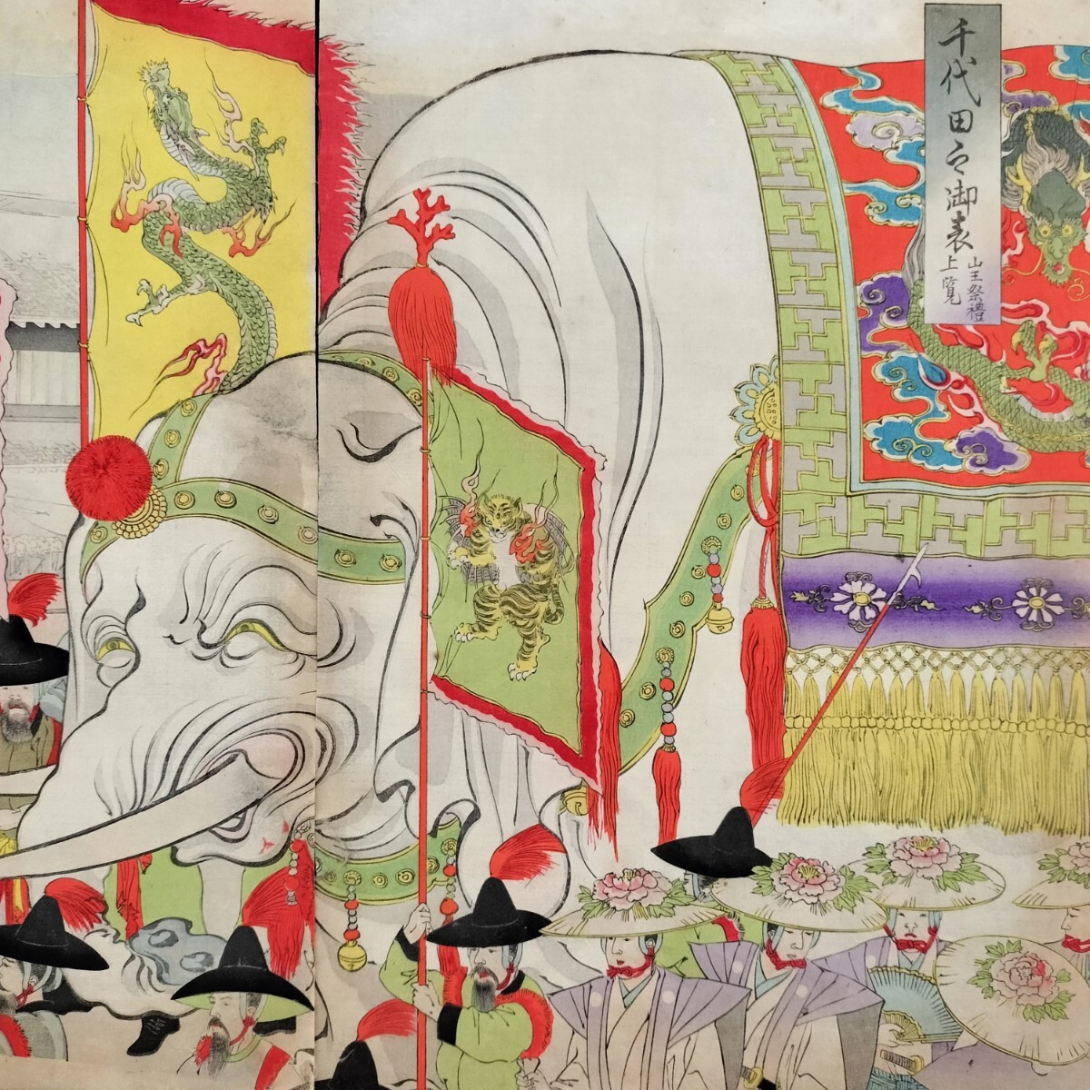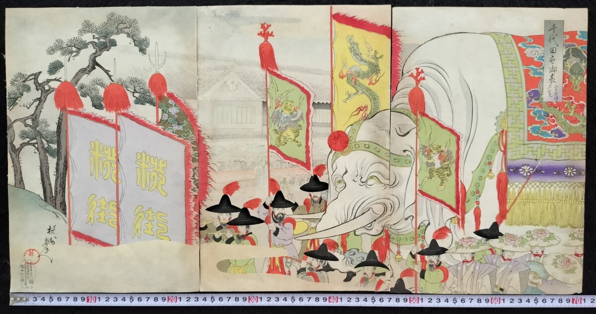 象!飛虎!龍!明治期/真作 楊洲周延「千代田之御表 山王祭礼上覧」本物浮世絵木版画 名所絵 錦絵 大判 三枚続き 裏打ち
