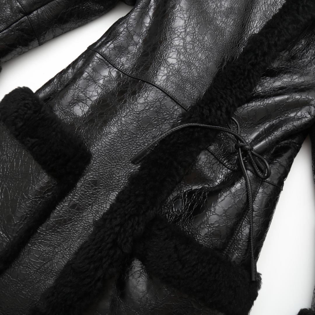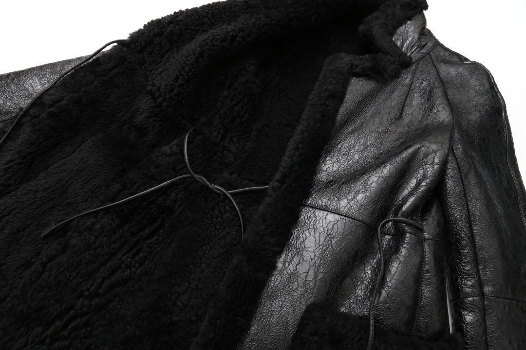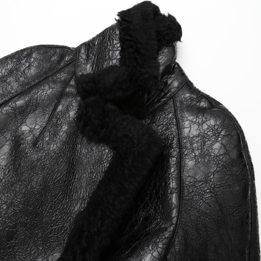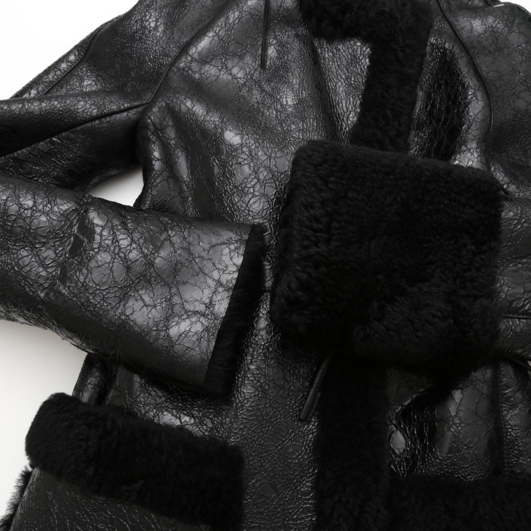 ボア面は艶やかで高密度、レザー面は光沢のあるナッパラン加工で、ひび割れたようなクラックレザー調の質感が特徴です。