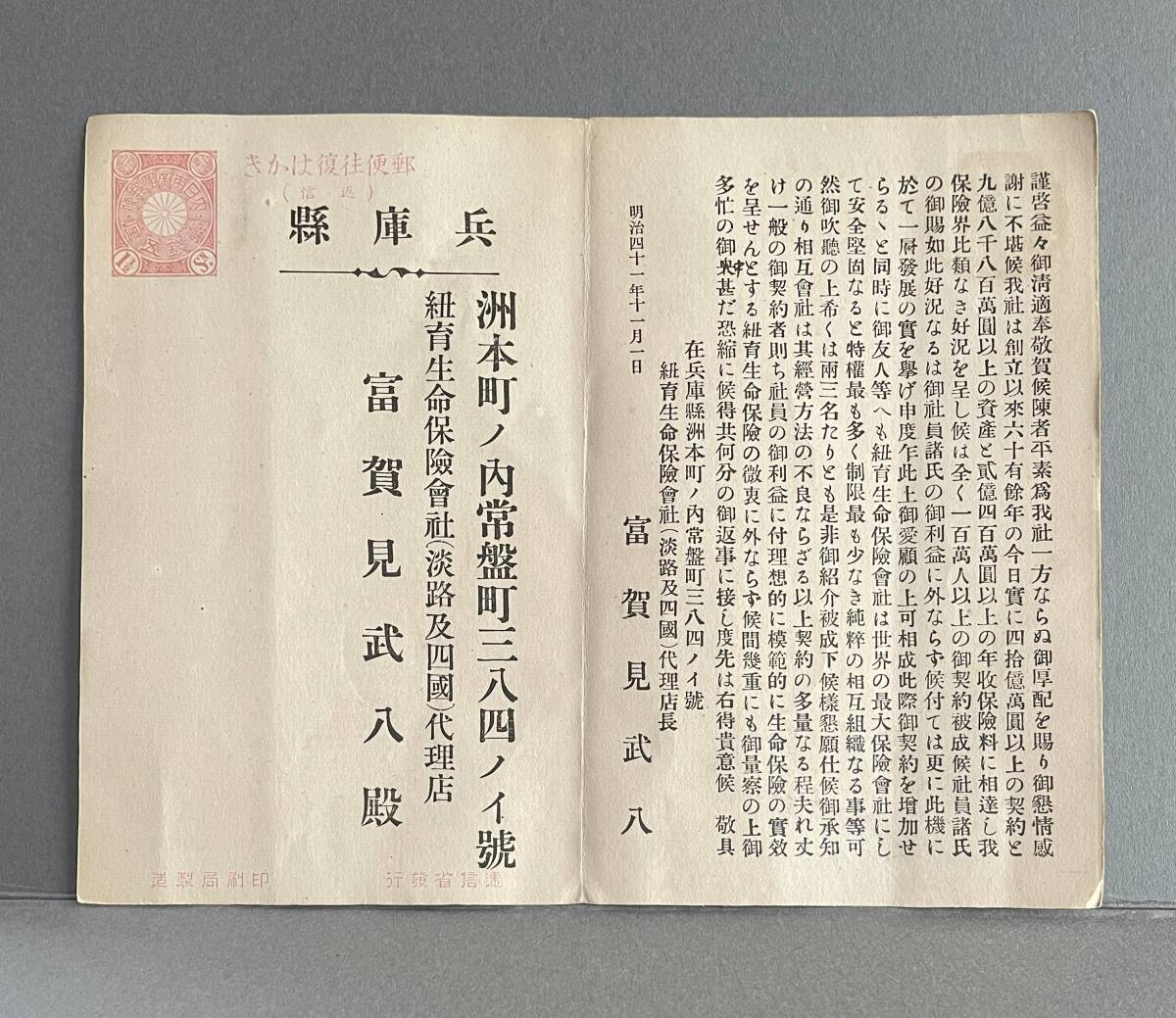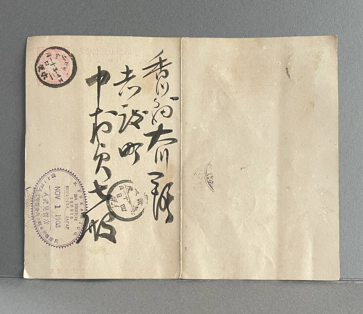 ■エンタイア 1銭5厘枠なし菊往復はがき 局名不明 四十一年十一月 二日 ホ便