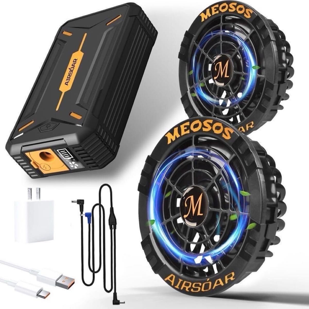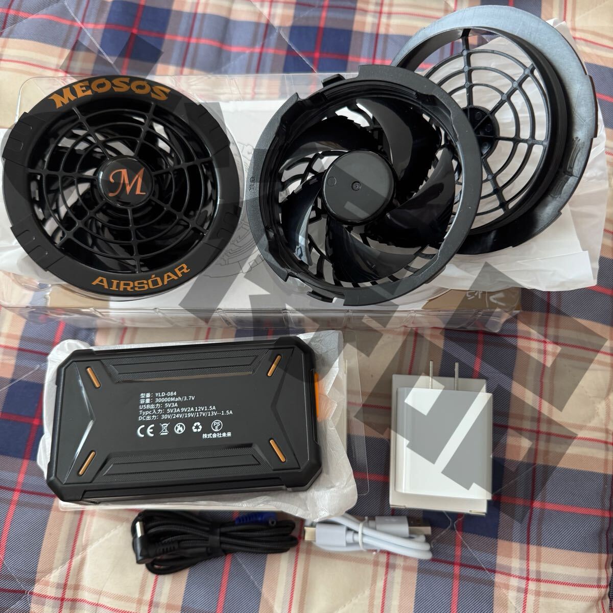 セット内容:ファンx2、30Vバッテリーx1、18W ACアダプターx1、接続ケーブルx1、バッテリー用充電ケーブルx1、モバイルバッテリー用取扱説明書x1、ファン用取扱説明書x1。