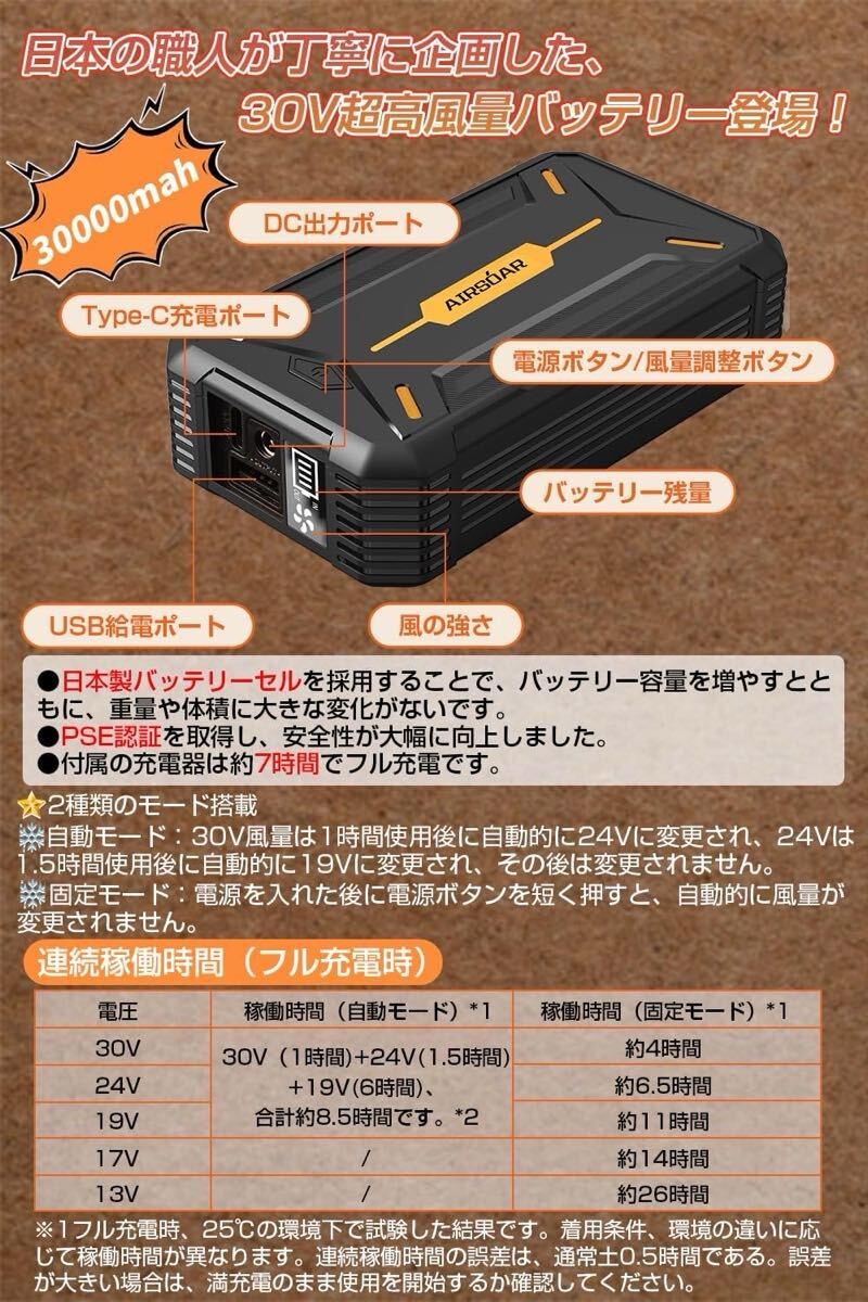 【PSE認証30000mAhバッテリー付き】最新版の30000mAhバッテリーは日本製のバッテリーセルを採用しており、大容量ながら重さは403gにとどまり、体積も10%小さく、耐久性も大幅に向上しています!「自動モード」の使用時間は約8.5時間、「30V」風力は4時間、「24V」風力は6.5時間、「19V」風力は11時間、「17V」風力は14時間、「13V」風力は26時間で、従来の使用時間に比べて大幅にアップしました!長時間仕事をしていても常に涼しい風を感じることができます。商品は18W ACアダプターを含み、満充電時間は約7時間です。