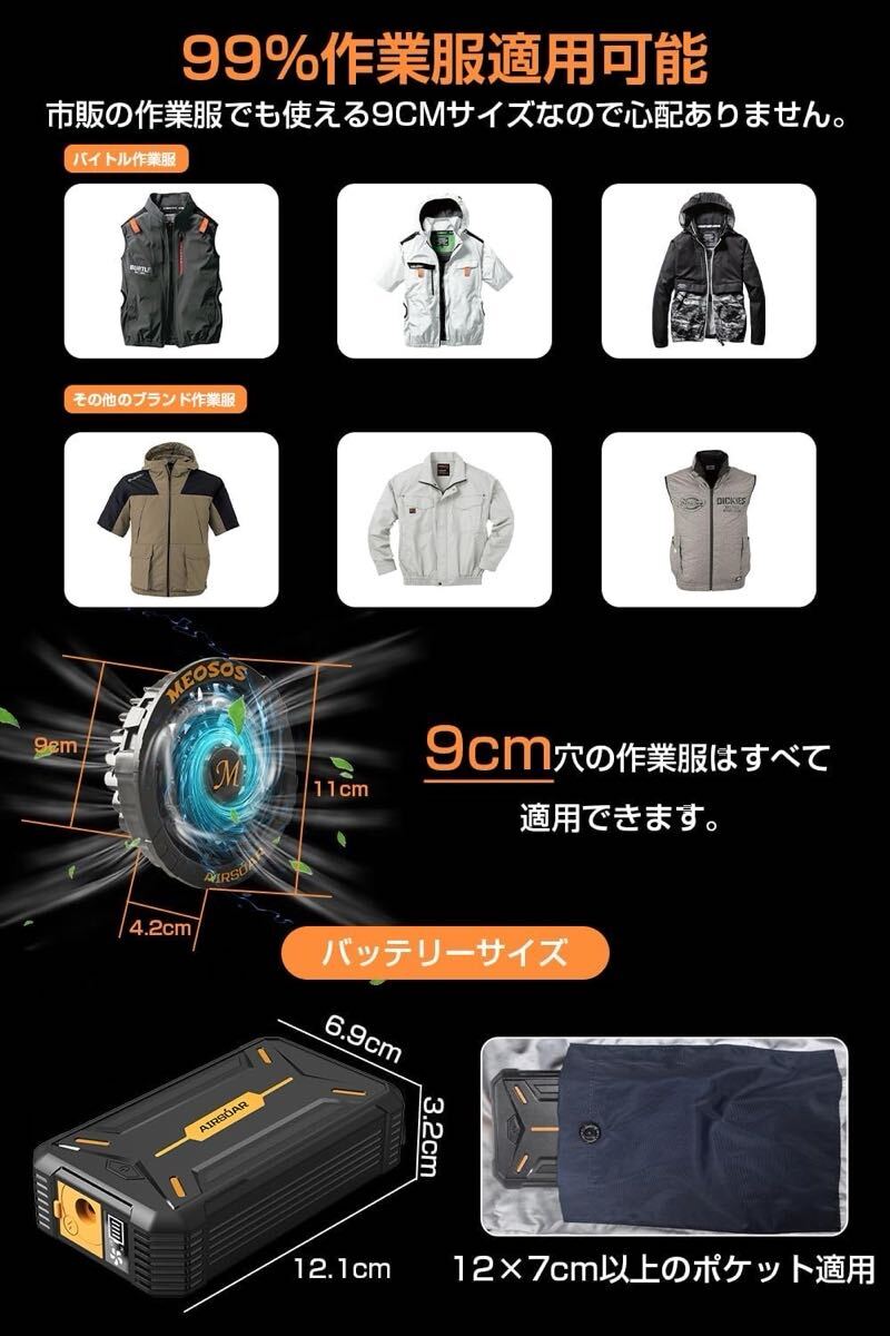 作業服適用直径:9cm、電池サイズ:6.9x12x3.2cm。