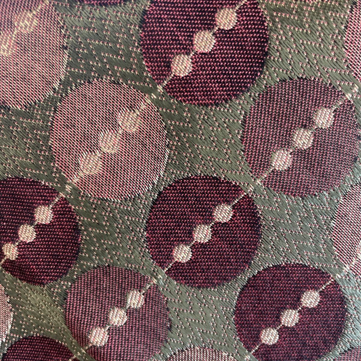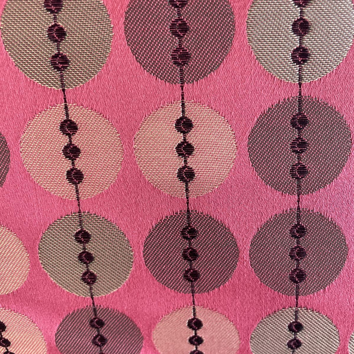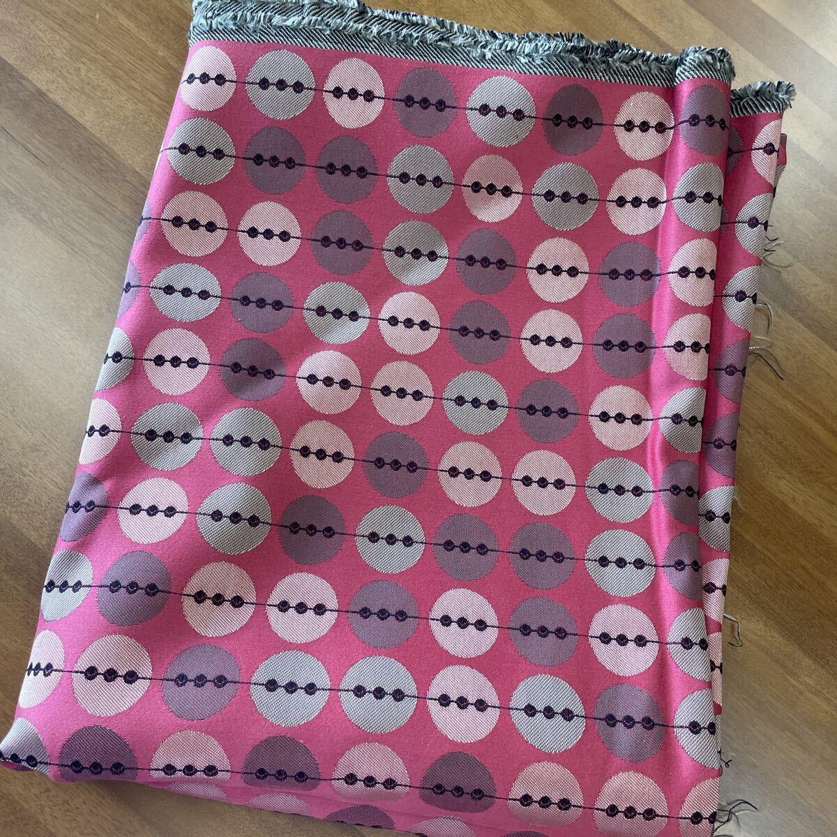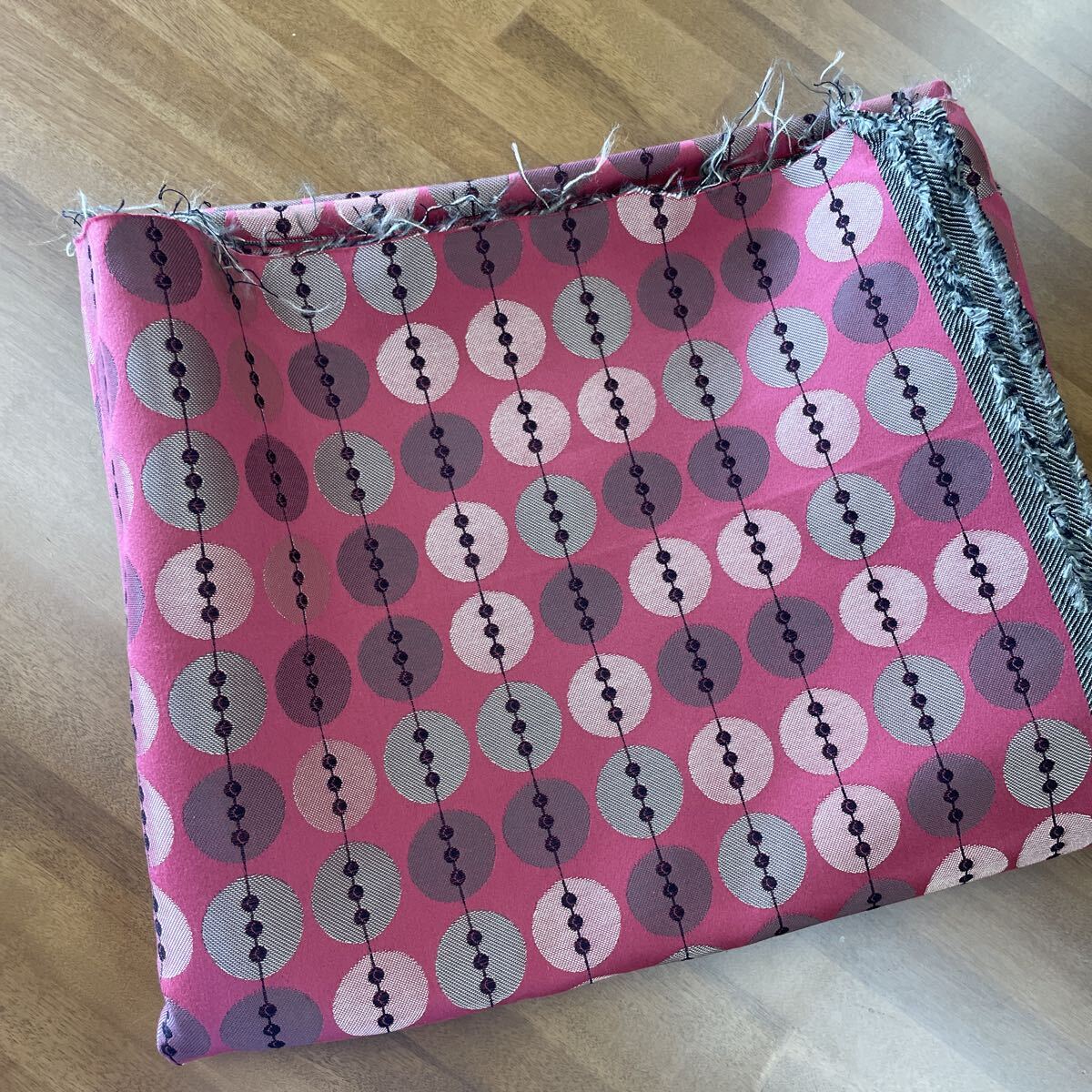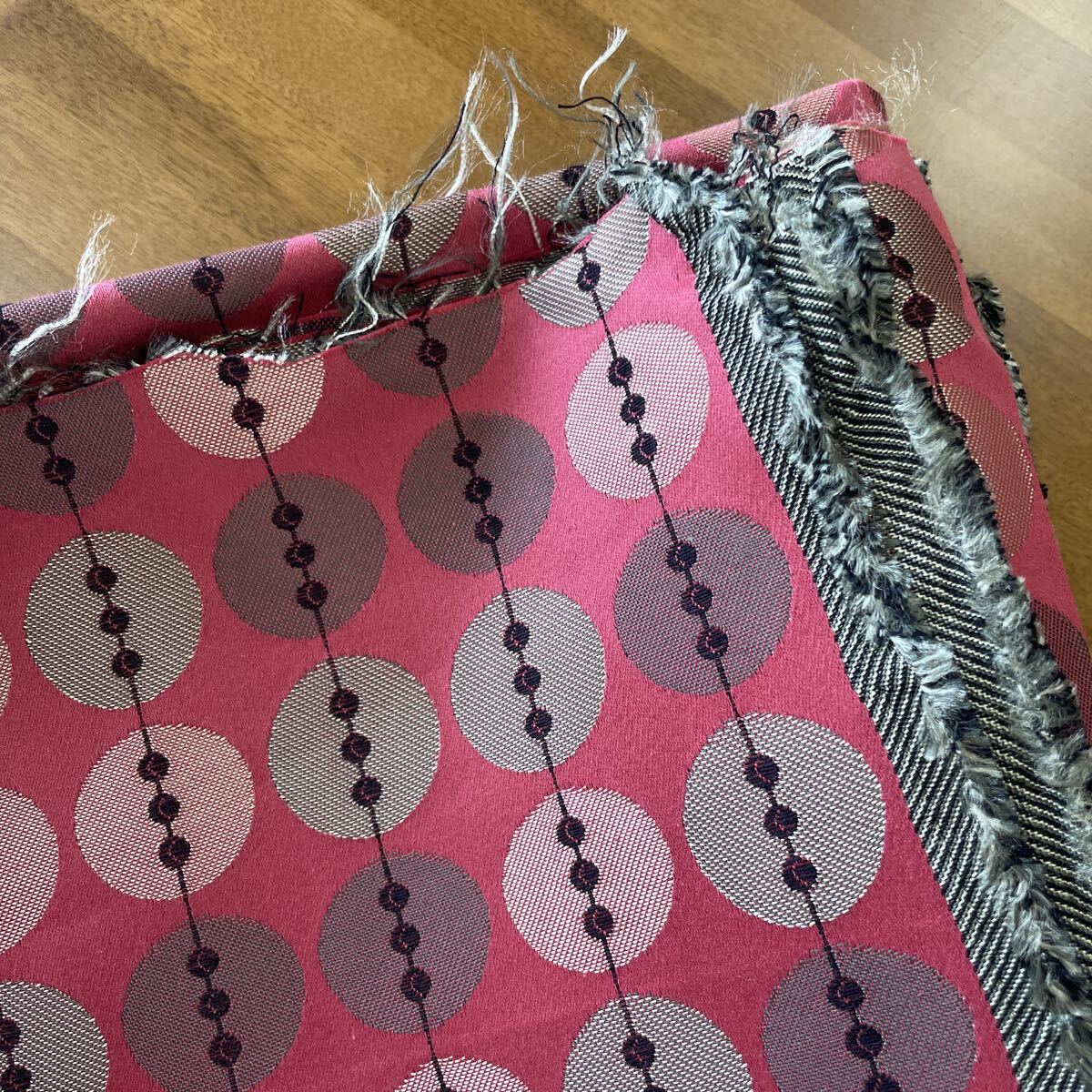 ピンク系の地に、グレーやレッド調のドットが連なるデザインの生地になります。