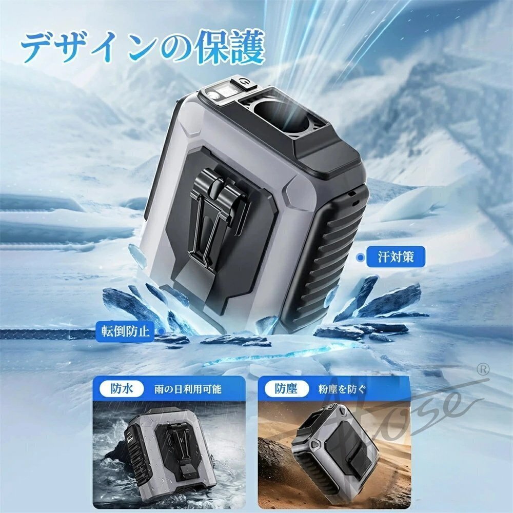 【軽量コンパクトで耐落下設計】 この ベルトファン は、9.8*8.6*4.6cmのコンパクトなサイズと、わずか270gの軽量ボディで設計され。軽いので、長時間首にかけていても疲れ感じません。腰掛けファンケースはシリコン素材を使用しており、優れた緩衝性と耐衝撃性を備えています。ファンが高いところから落下した場合でも、シリコンケースが衝撃を効果的に吸収し、内部の機械部品へのダメージを軽減します。扇風機 ベルト長期間屋外環境にさらされても、簡単に拭くだけで外観を清潔に保つことができます。