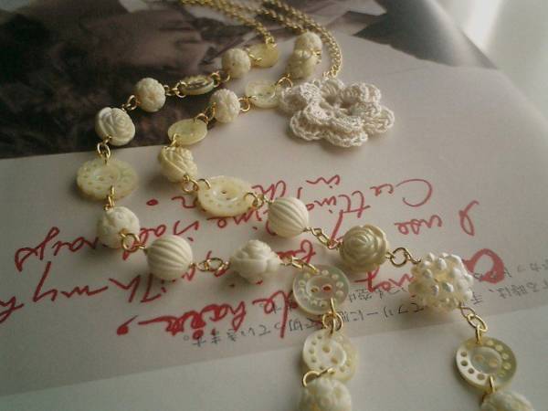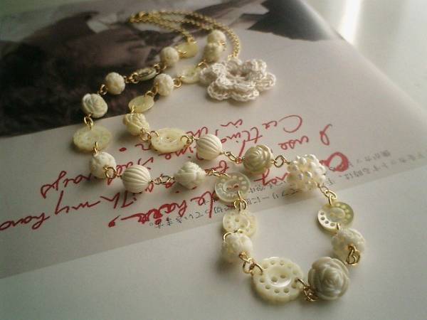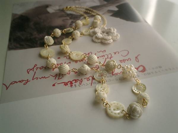 アート・ロマン主義・・シリーズです♪少女の感性・・可憐なオフ・ホワイトのネックレスです♪オフ・ホワイト、オフ・ベージュ色でまとめてふんわりやさしい表情です♪11ミリの穴あきボーンや11ミリから15ミリ位までのレース模様のような透かしシェルボタンには薔薇の樹脂ビーズや15ミリの淡水パール玉を合わせて可憐な表情です♪長さは全長75センチ位で調節自由です♪ブレスにされても可愛いです♪お揃いのネックレスも出品しています♪♪シンプルで飽きのこないいつまでも着けられるデザインを考えて作りました!ハンドメイドをご理解頂いてノークレーム、ノーリターンでお願いします