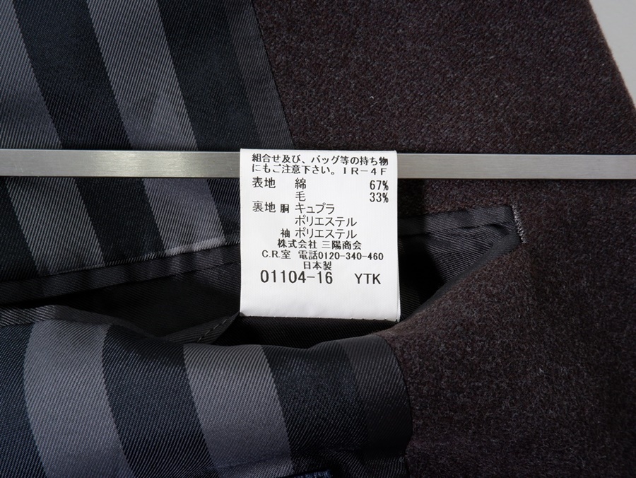 コットン67%ウール33% 裏地キュプラ・ポリエステル 袖キュプラ |