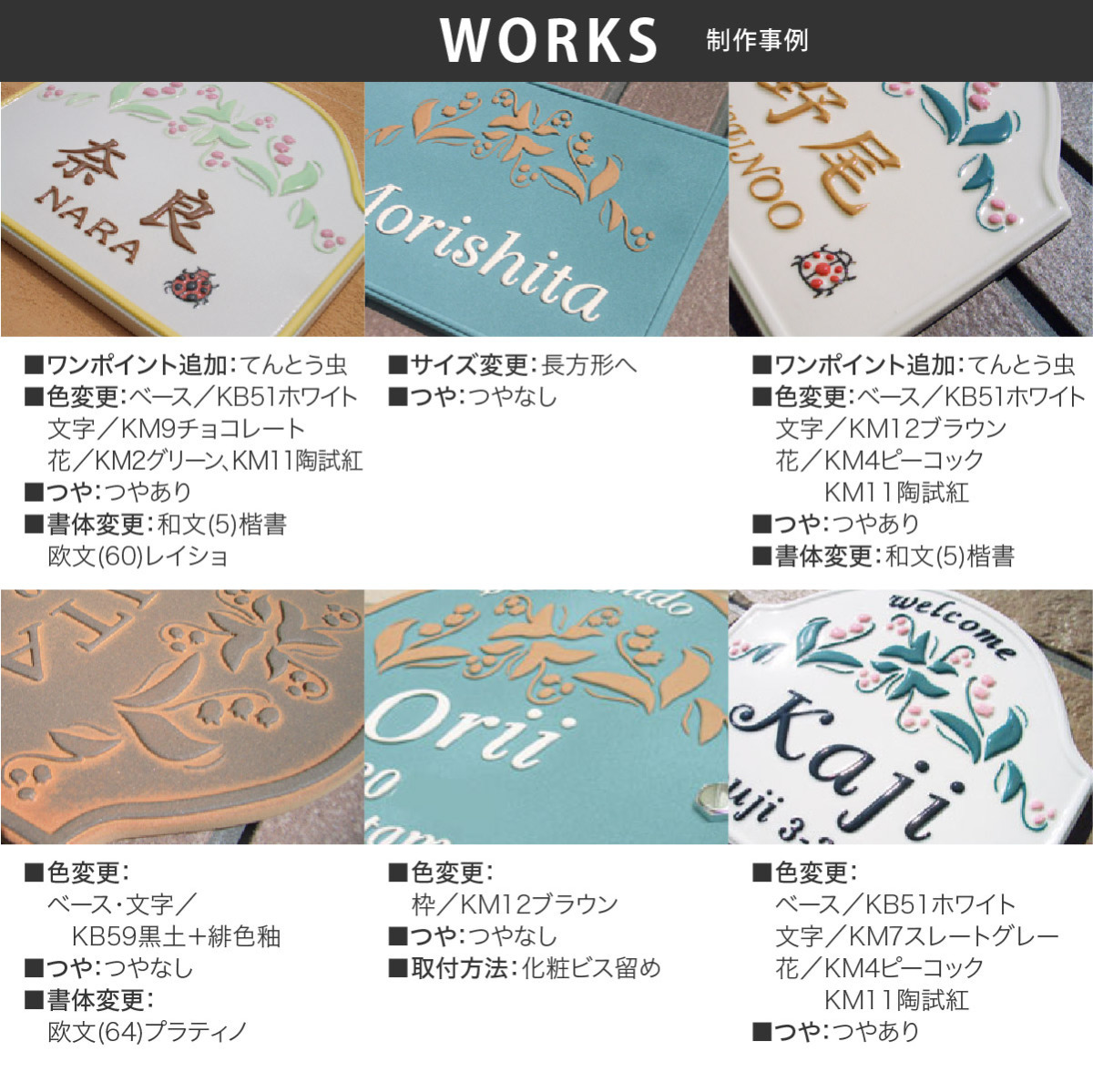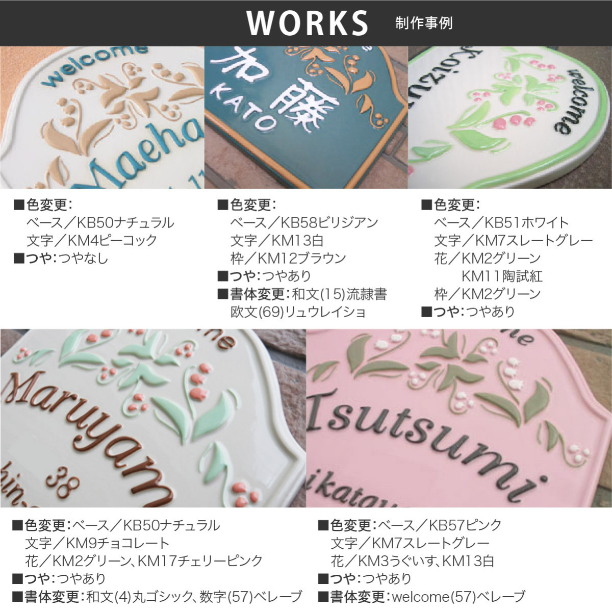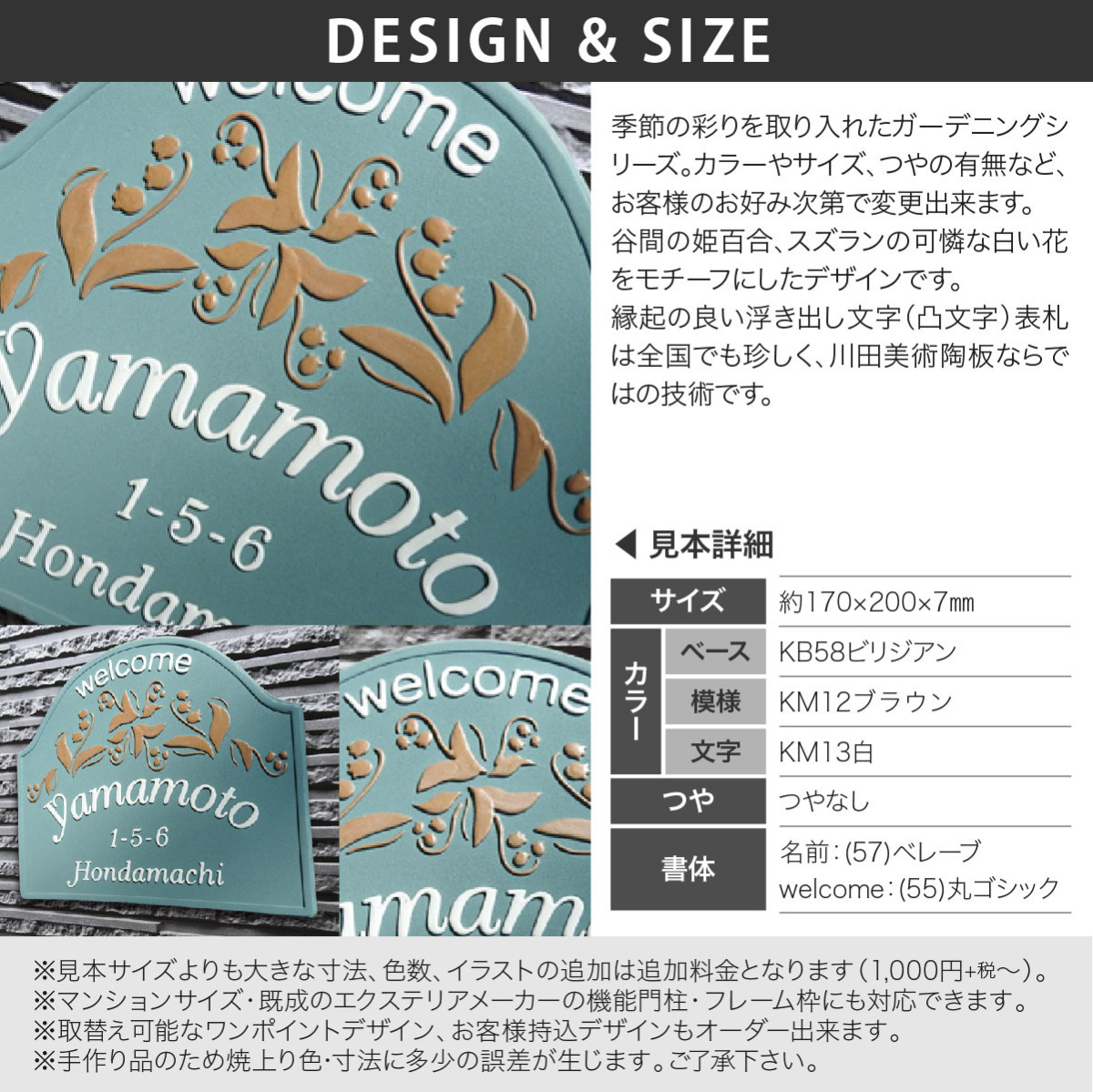 | 商品詳細 | 季節の彩りを取り入れたガーデニングシリーズ。カラーやサイズ、つやの有無など、お客様のお好み次第で変更出来ます。谷間の姫百合、スズランの可憐な白い花をモチーフにしたデザインです。縁起の良い浮き出し文字(凸文字)表札は全国でも珍しく、川田美術陶板ならではの技術です。 |