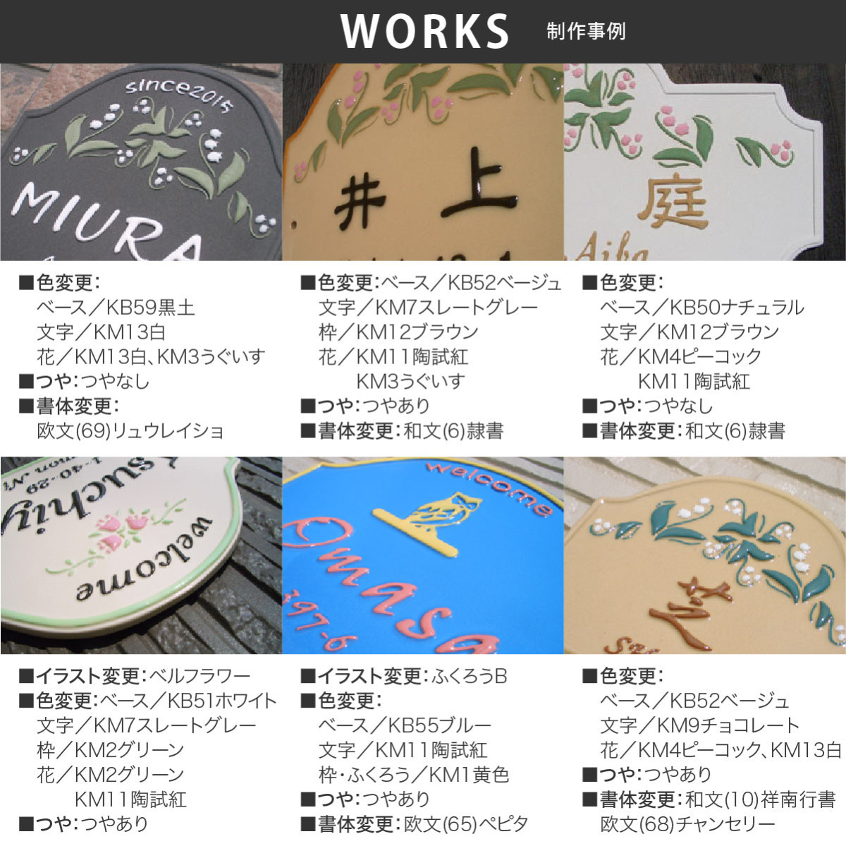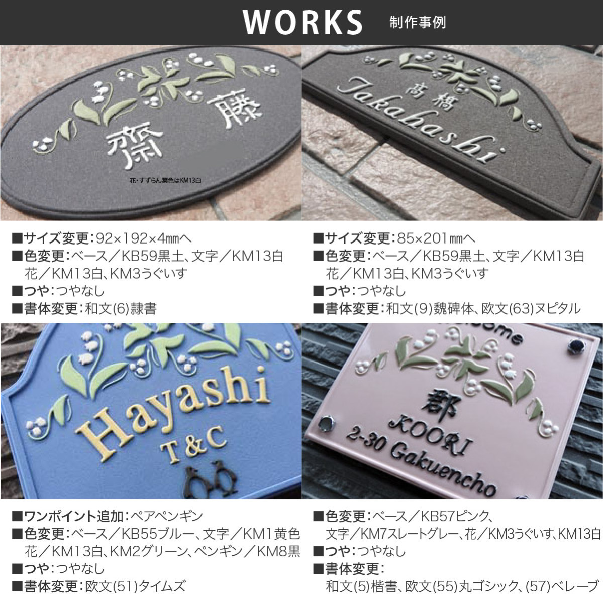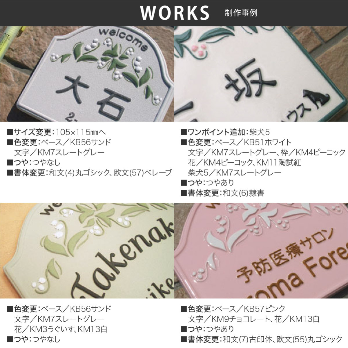 | 商品詳細 | 季節の彩りを取り入れたガーデニングシリーズ。カラーやサイズ、つやの有無など、お客様のお好み次第で変更出来ます。谷間の姫百合、スズランの可憐な白い花をモチーフにしたデザインです。縁起の良い浮き出し文字(凸文字)表札は全国でも珍しく、川田美術陶板ならではの技術です。 |