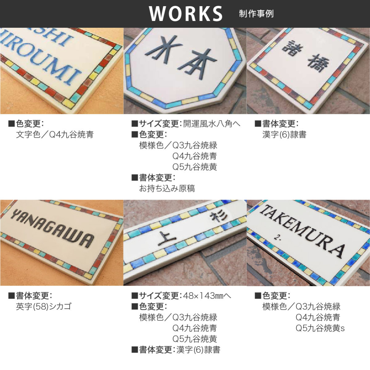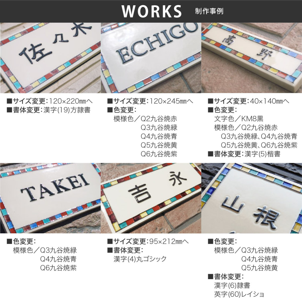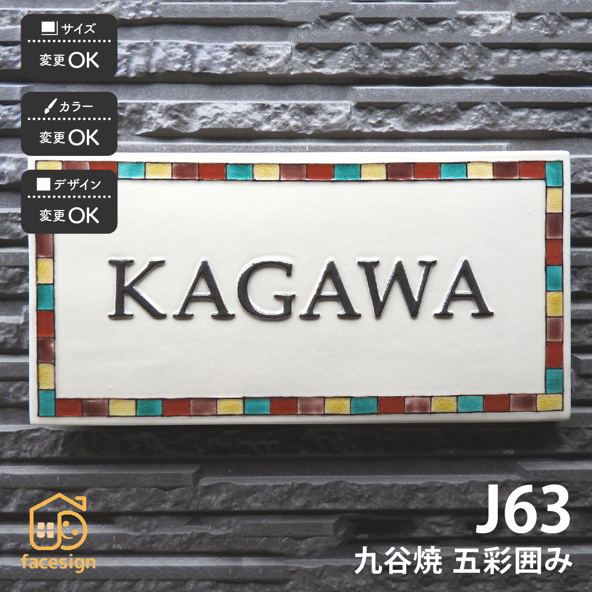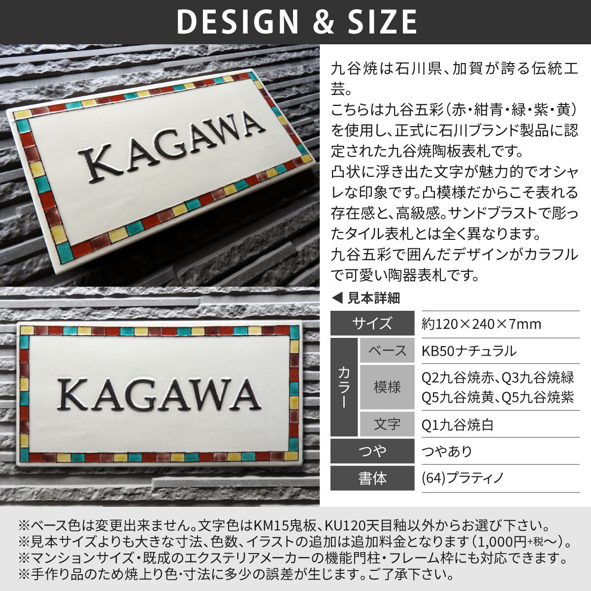 | 商品詳細 | 九谷焼は石川県、加賀が誇る伝統工芸。こちらは九谷五彩(赤・紺青・緑・紫・黄)を使用し、正式に石川ブランド製品に認定された九谷焼陶板表札です。凸状に浮き出た文字が魅力的でオシャレな印象です。凸模様だからこそ表れる存在感と、高級感。サンドブラストで彫ったタイル表札とは全く異なります。九谷五彩で囲んだデザインがカラフルで可愛い陶器表札です。 |