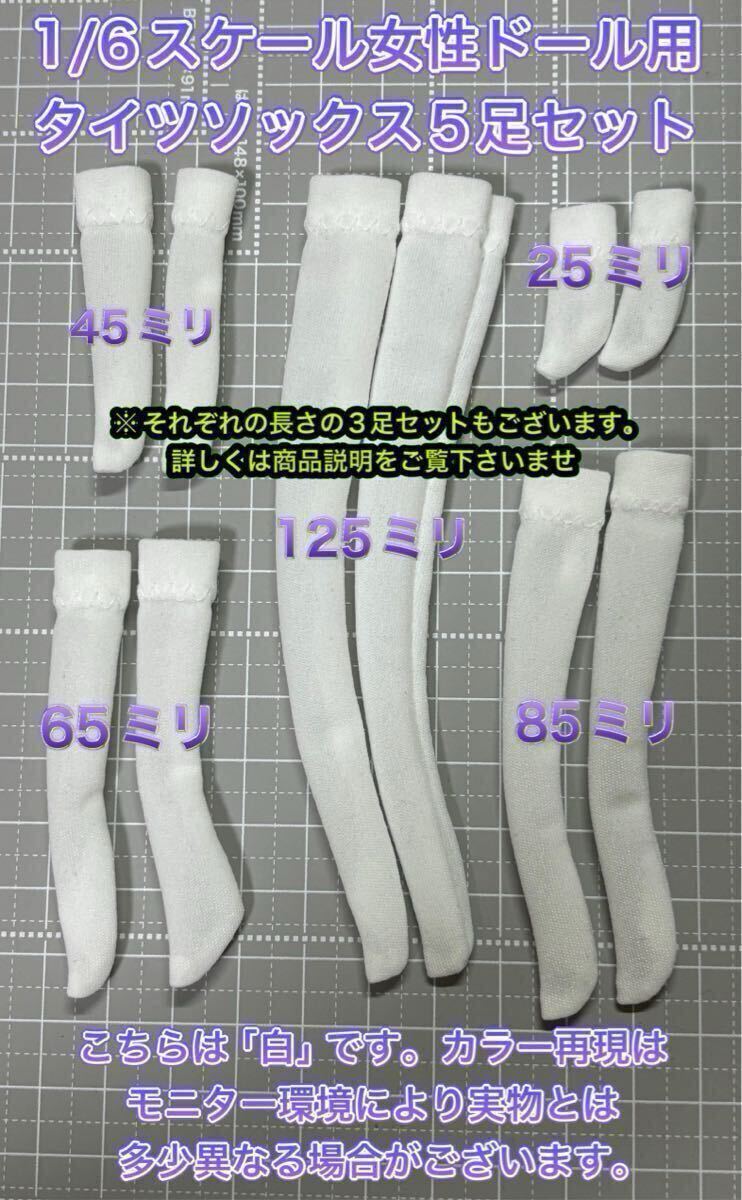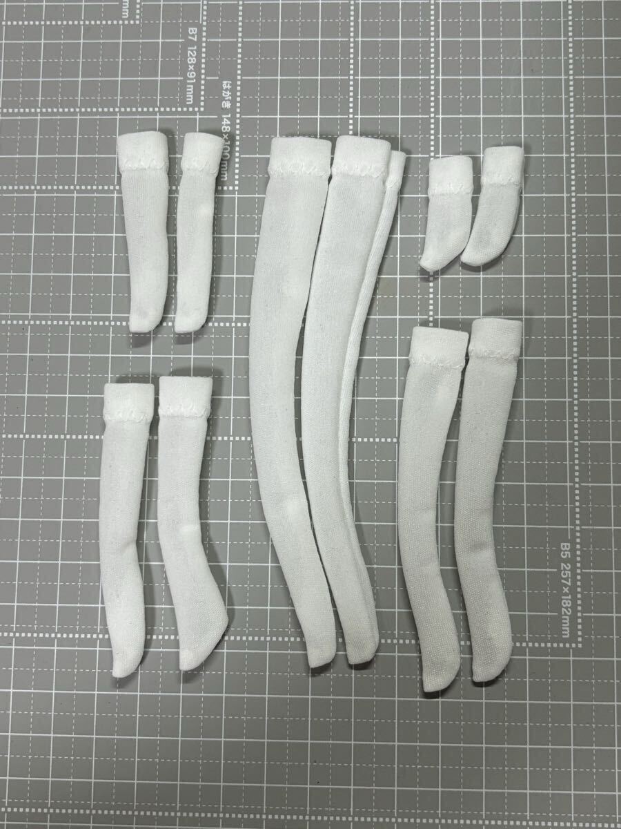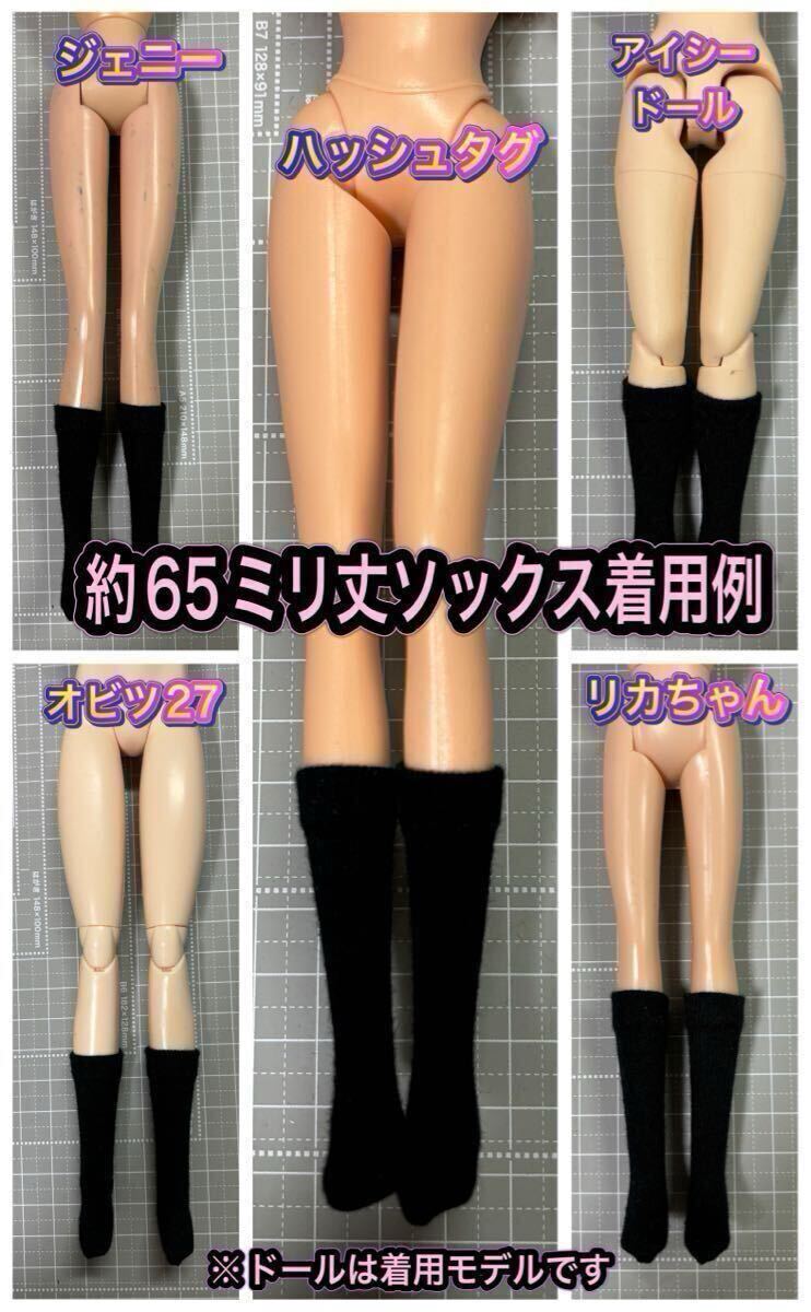 リカちゃん、ジェニー、ネオブライス、アイシードール 、オビツ27女性ボディ、ハッシュタグボディなどが着用出来る、薄手の化繊ソックス長さ違い、平置きで約125ミリ、85ミリ、65ミリ、45ミリ、25ミリの5足セットです。