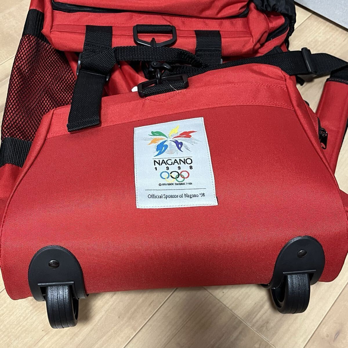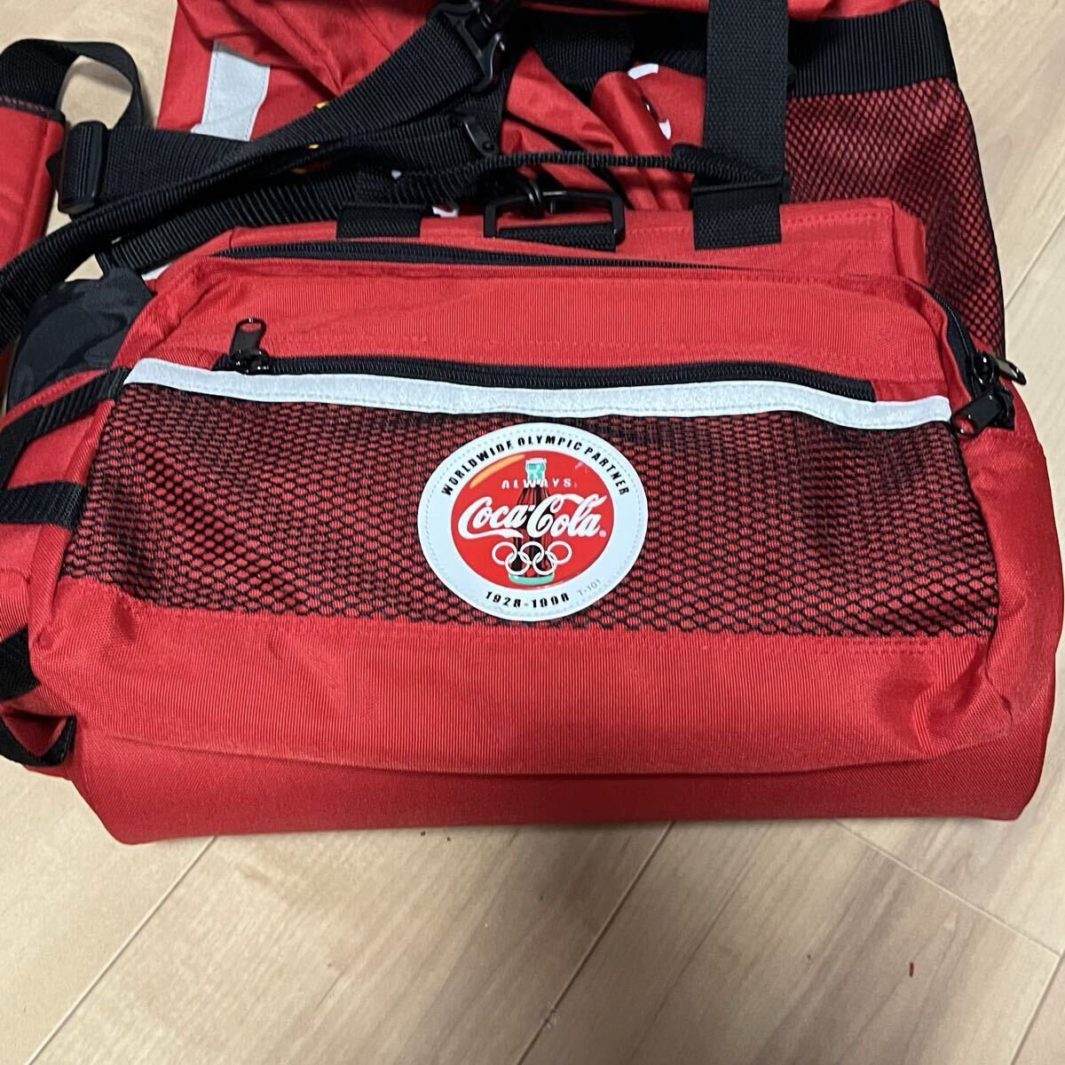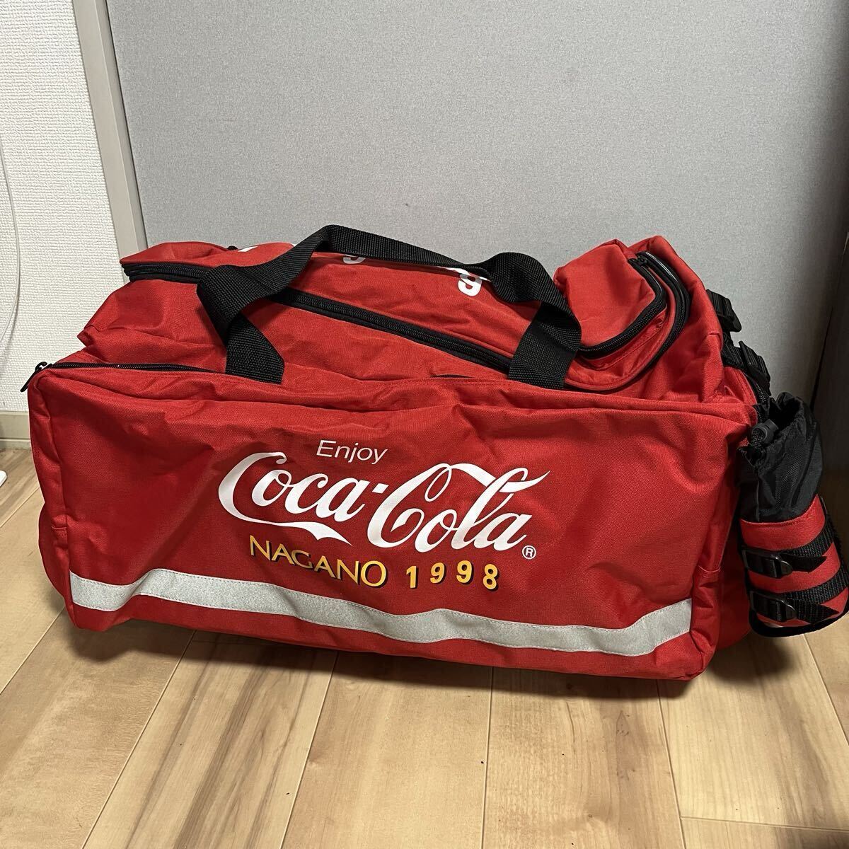 ■レア!非売品 コカコーラ 1998 長野オリンピック キャリーバッグ ボストンバック ショルダーバック 90s 1998年 当時の長野オリンピックを記念したコカコーラの懸賞、当選グッズです。 希少!非売品!特大ボストンバッグです。 20年以上経過していますが保存状態が良く綺麗な状態です。 2輪のキャスターが付き移動も便利です。 グレーに見える部分はリフレクターで暗闇で光りががあたると反射します。 メイン収納以外にもジッパー付きのサイドポケット、ミニポケットなどがあり、多機能です。 外側にあるボトルホルダー&ジッパーポケットは 脱着可能でウエストバッグになります。 パッド付きショルダーストラップが付いています。 ■大きさ ・タテ約37cm ・ヨコ約68cm ・マチ約33cm ■状態 ・未使用の自宅保管品ですが、長期保管の為未使用に近いとしています。 ・保管時の多少の擦れなどはあるかと思いますが、酷い汚れや破れはありません。 ・カバン外部、内部共にベタつきなど無く綺麗です。 ・各ジッパーの開閉もスムーズです。 ・念の為画像で状態判断お願い致します。 ・自宅保管品にご理解のない方や新品のような完璧なコンディションを望まれる方は入札をお控え下さい。