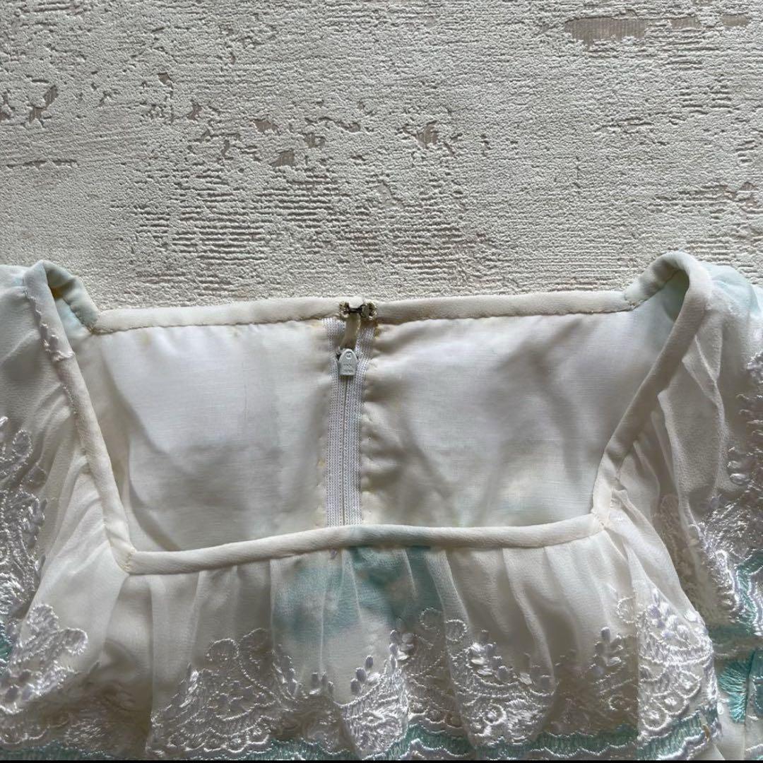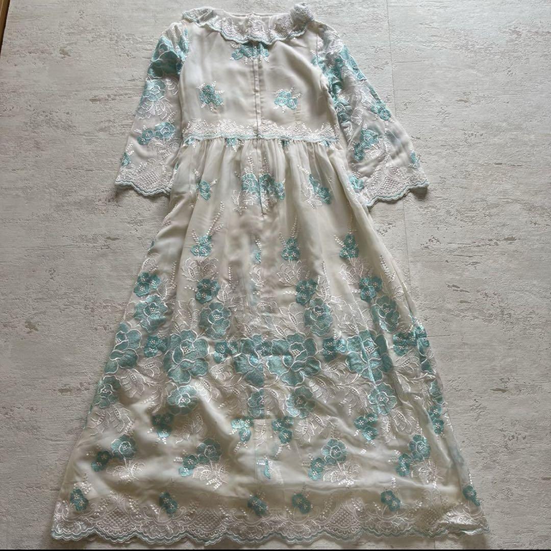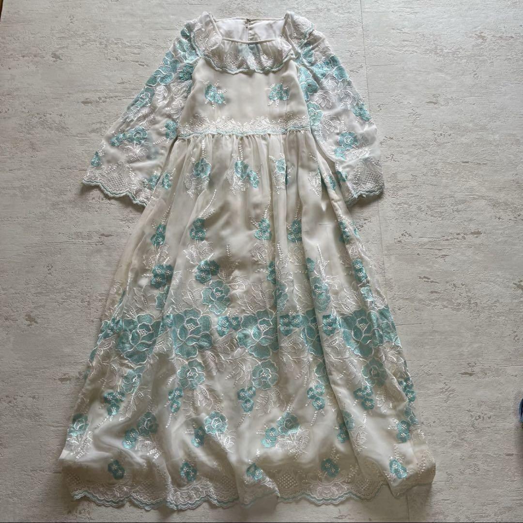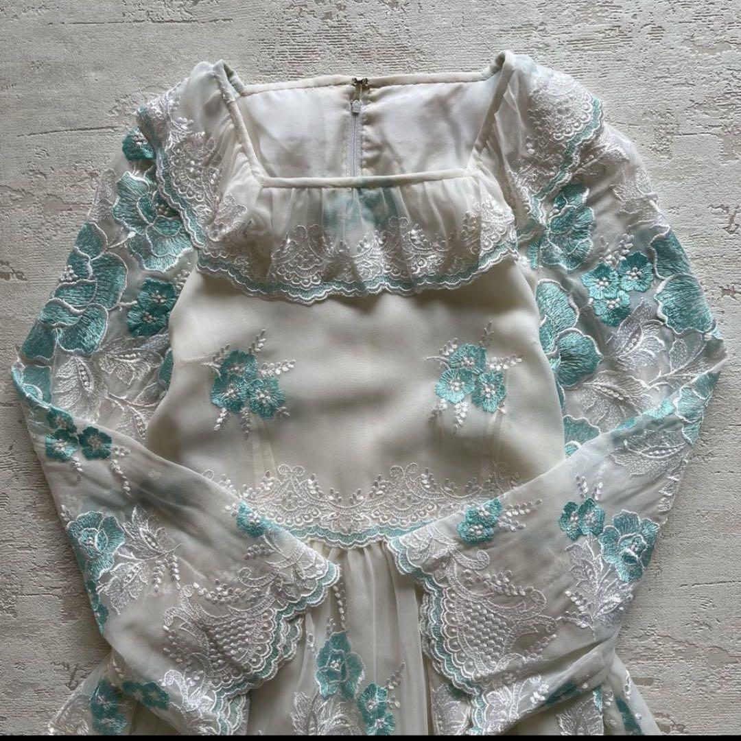 上品 刺繍レース ロングワンピース ホワイト×ブルー 花柄 結婚式 長袖 K1