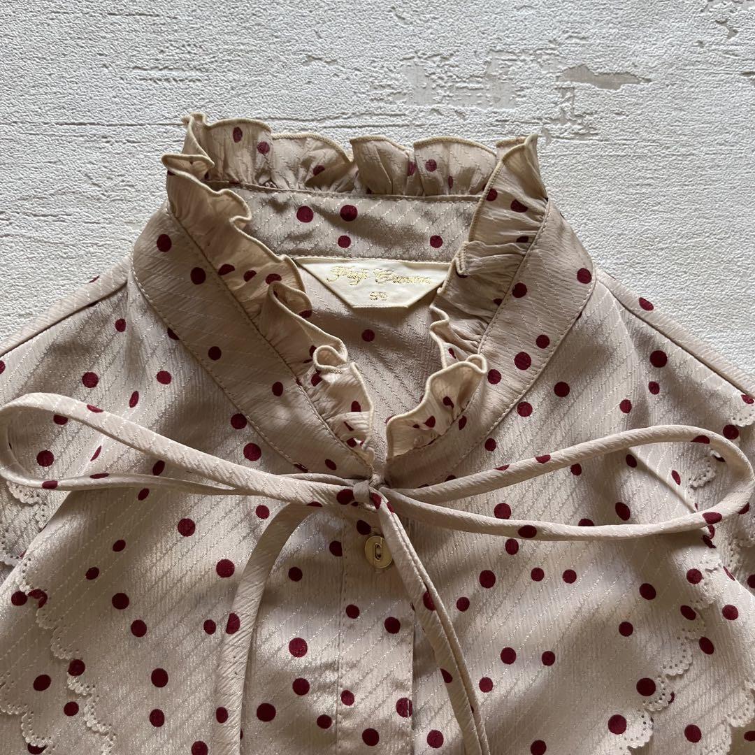 フリル襟 リボン付き ドット柄 ブラウス 長袖 ガーリー レトロ ベージュL1