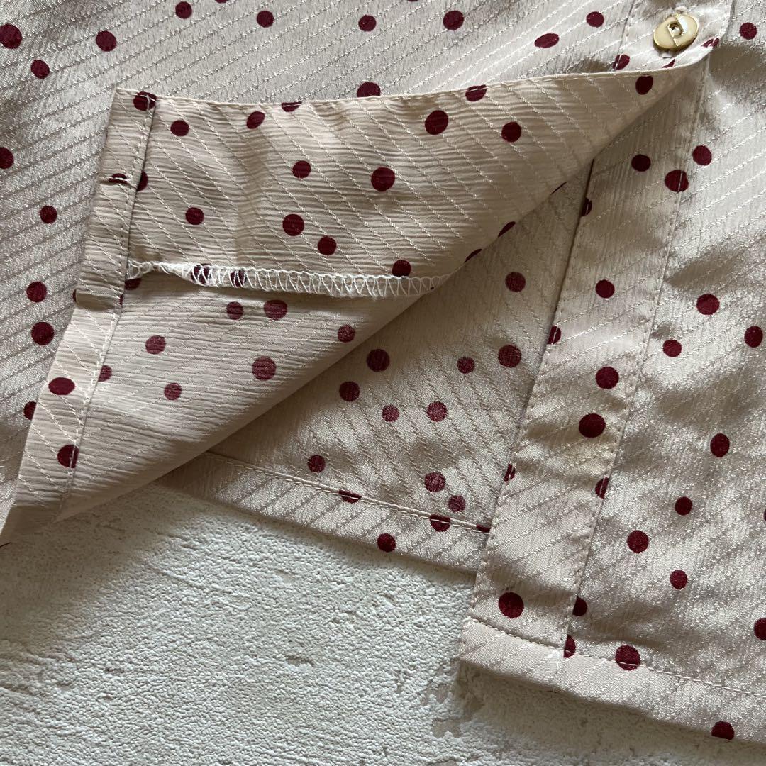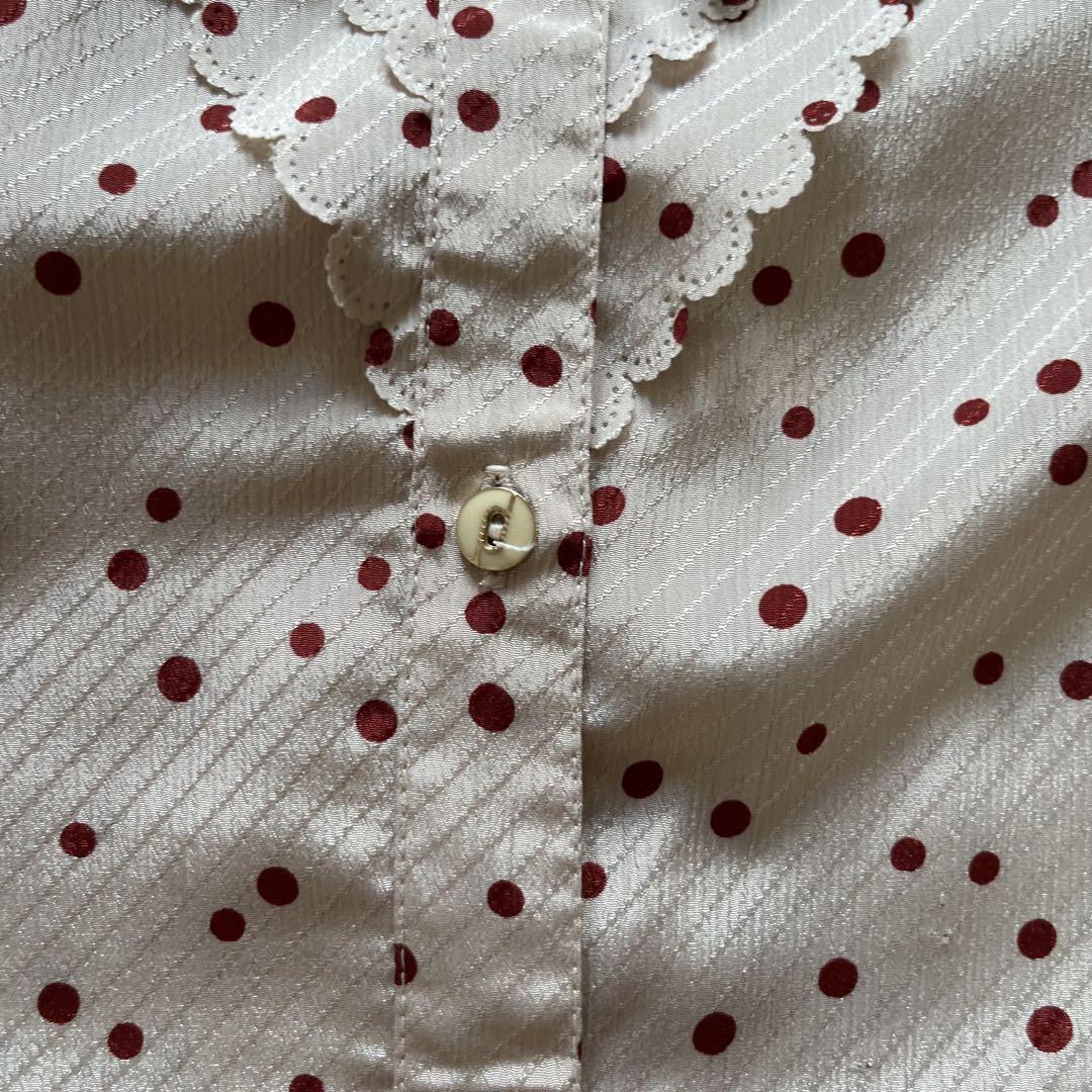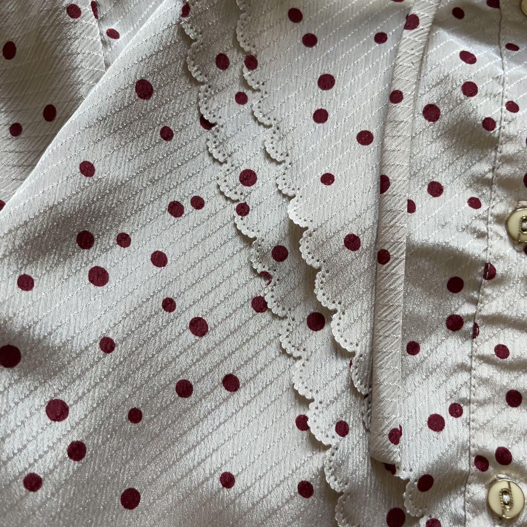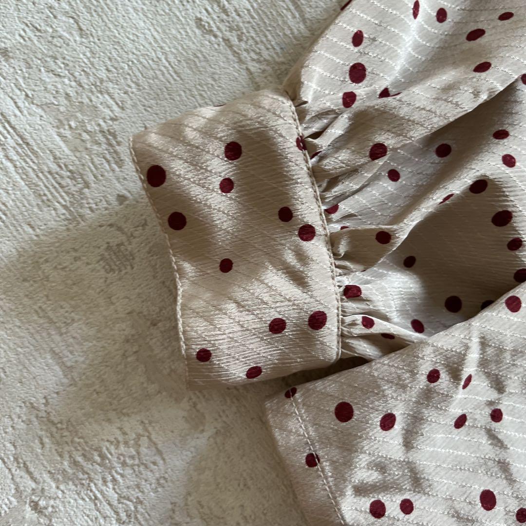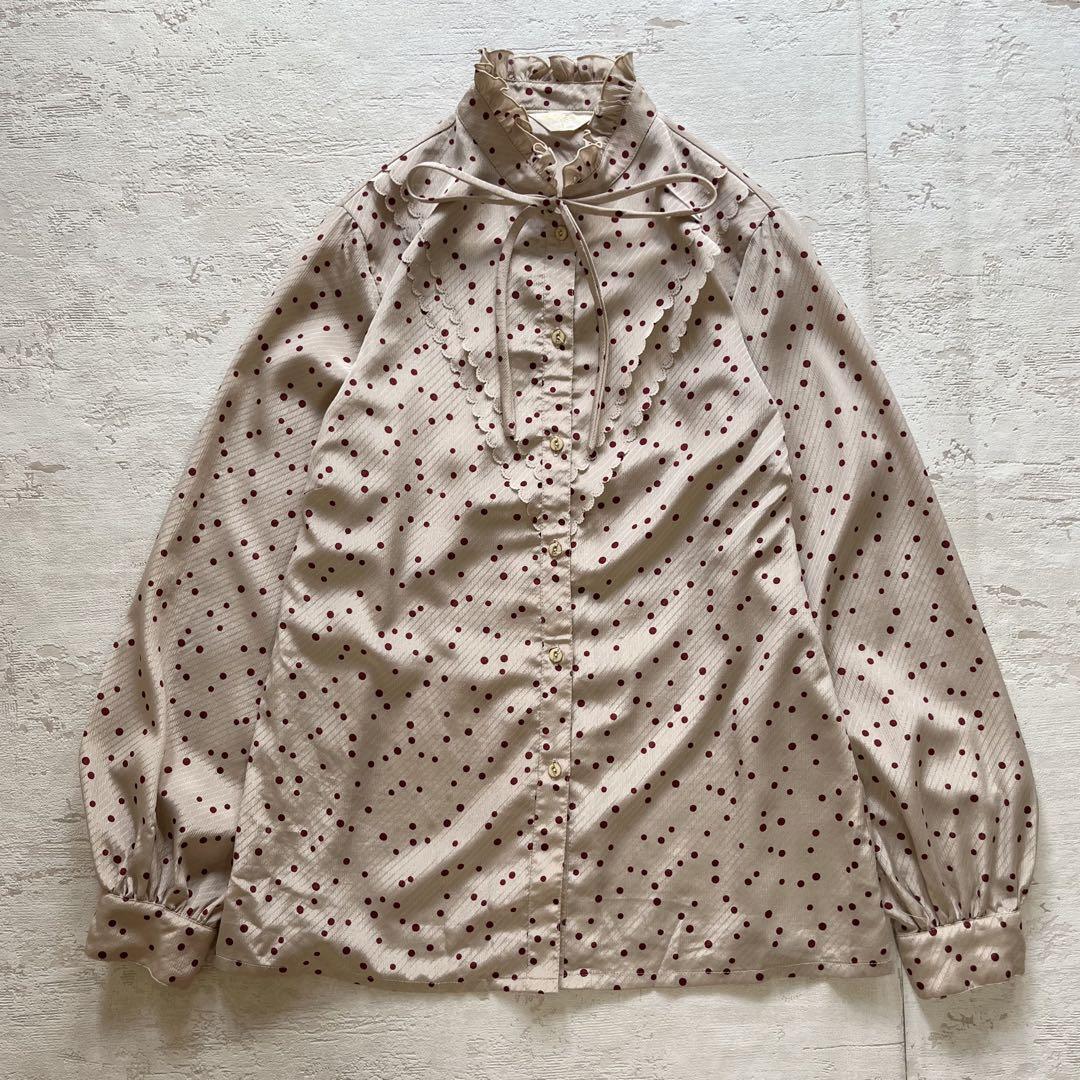 フリル襟とリボンタイがアクセントになった、ガーリーでクラシカルな長袖ブラウスです。ベージュ地にワインレッドのドット柄が映え、レトロで上品な雰囲気を演出。秋コーデの主役になるアイテムで、スカートにもパンツにも合わせやすく、オンオフ問わず活躍します。軽やかな素材感で着心地も良く、ジャケットやカーディガンのインナーとしてもおすすめ。ガーリー好きの方はもちろん、ヴィンテージ風の着こなしを楽しみたい方にもぴったりの一枚です。