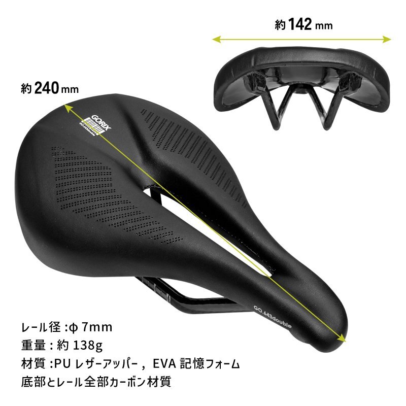 自転車の軽量化したい方やヒルクライムなどに! GO.643doubleからフルカーボン素材のショートサドルが新登場!! ロードバイクやクロスバイク、マウンテンバイクなどスポーツ自転車に最適なサドルです。 ベースのカーボンは振動吸収性に優れ軽量で剛性で良い乗り心地を。 ショートノーズ形状でペダリングがスムーズに。 人間工学に基づいた設計で長時間のロングライド走行も快適に。 スタイリッシュでぼたつかないおしゃれなスマートデザインはどんな自転車にもマッチ。 [ショートサドル] 全長が短く幅が広い形状 前乗りの時、ペダリングを妨げず高速巡行も違和感なく行えます。 [ショートノーズ] 流行りのショートノーズ形状 ノーズ部分が下方向に下がっていて前傾姿勢をとりやすい。 サドルが内ももに干渉せずペダリングをしやすい [軽量化] とても軽い約138g! 自転車の軽量化をしたい方にもおすすめです。 [フルカーボン] 振動吸収性に優れていてかつ軽量で剛性。 しなりがよく乗り心地が良い。 [程よく柔らかい座面] 高密度EVA記憶フォームを採用し座面の柔軟性が大幅に向上! 表面の材質には耐摩耗性に優れた防水PUレザー。 [穴あきデザイン] 中央部部を大きくくり抜いているため股への圧迫感が軽減されます。 両道の圧迫感からも解放。 また通気性にも優れ熱こもりを抑え快適を維持。 [長時間でも快適に] フロントスリムなデザインと人間工学に基づいた設計は、足と太ももの摩擦を防ぐことができます。 商品内容自転車カーボンサドル サドル寸法長L240× 幅W142mm レール径φ7mm 重量約138g 材質底部とレール全部カーボン材質 PUレザー, EVA記憶フォーム カラーブラック 商品は入荷によりキズがある場合があります。 傷や細かい汚れが気になる方や神経質な方は入札をお控え下さい。 入荷時期により予告無く一部仕様変更する場合が有ります。 カラーはディスプレイ種類環境等により実物と異なって見える場合がございます。 |