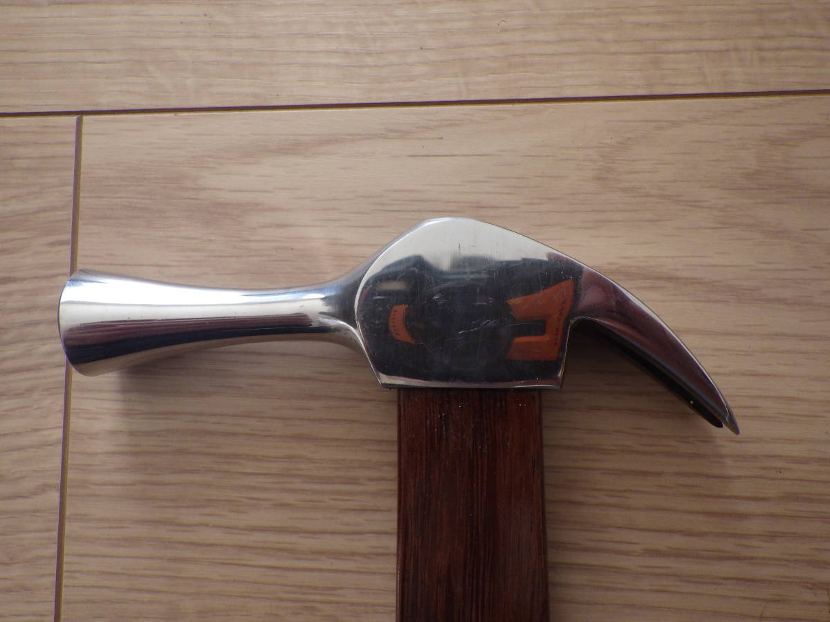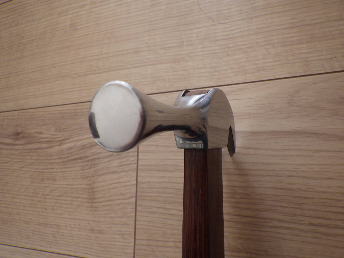 未使用長期保管品の丸速製鍛造ステンレス製仮枠ハンマー(普通型サイズ少々)に新たにアジアンウォールナット製グリップ柄を挿げたものです。刻印はありませんが、頭部形状から丸速製と判断致しました。