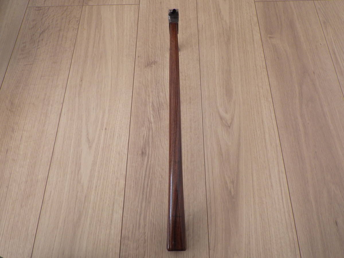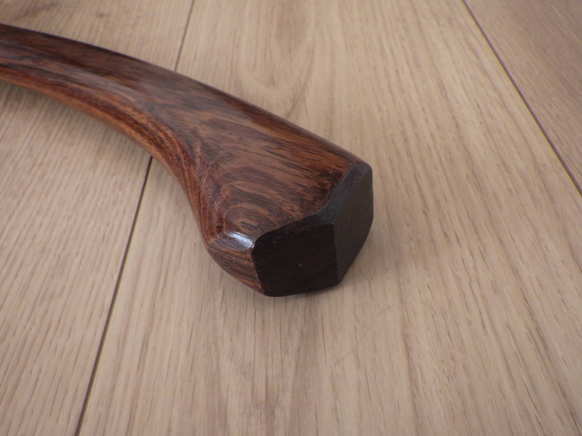 アジアンウォールナット製グリップ柄は新たに製作した物です。全体の形状は曲がり柄で握り部分の断面は逆おにぎり型、すっぽ抜け防止のために柄尻をグリップ状に成形してあります。柄は櫃穴一杯まで固く仕込んでありますので楔は打っておりませんが、中古の楔を1本お付けします。(写真には写っておりません。)