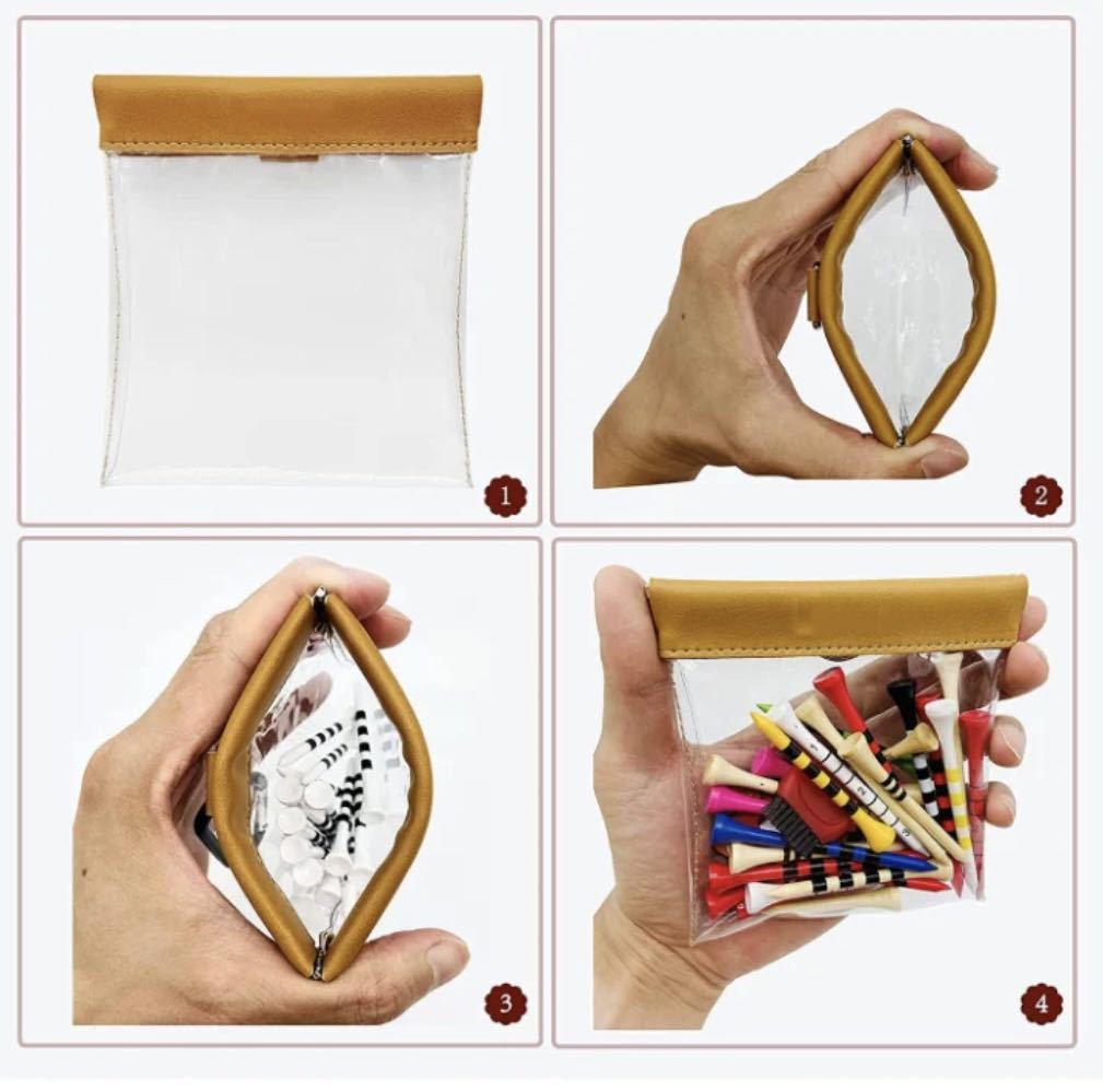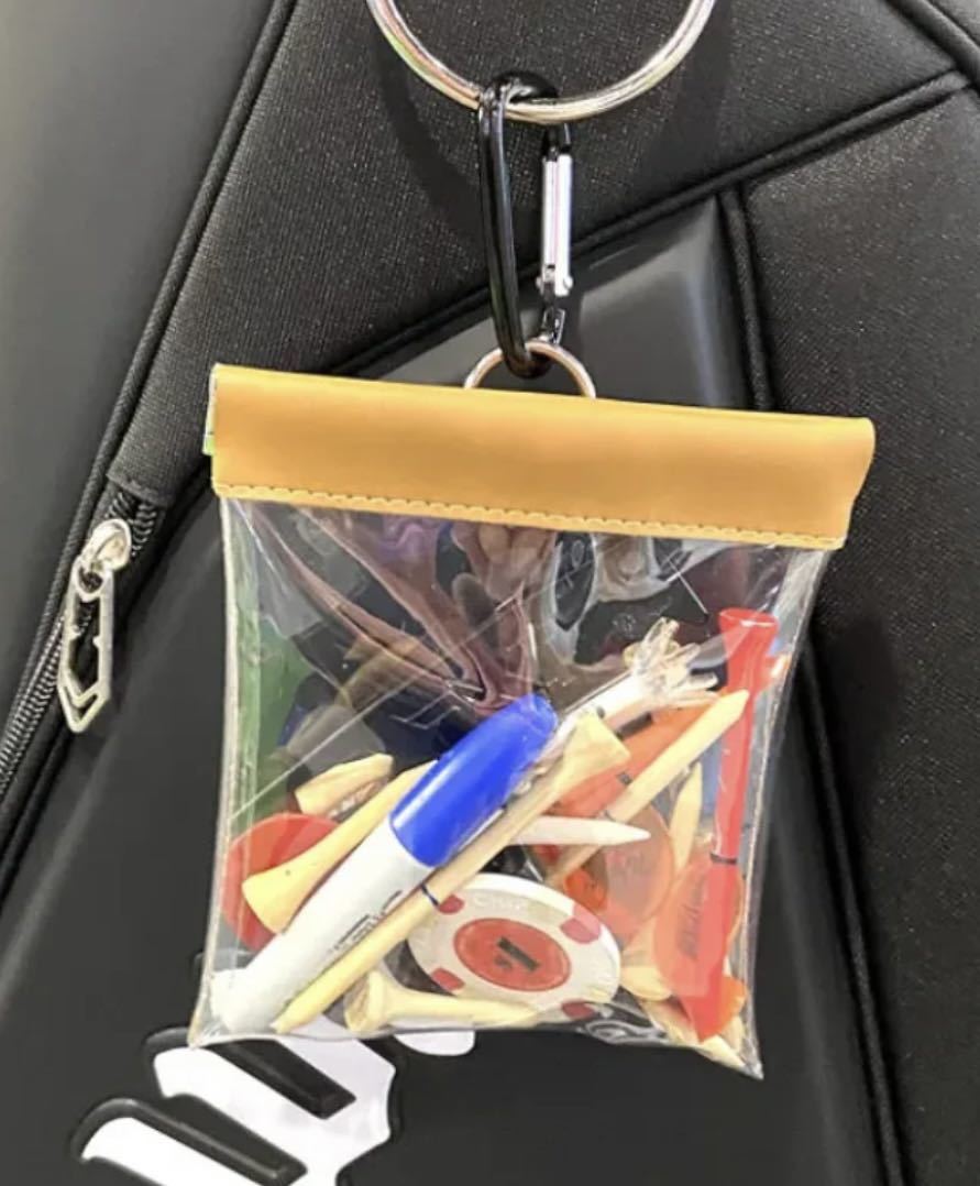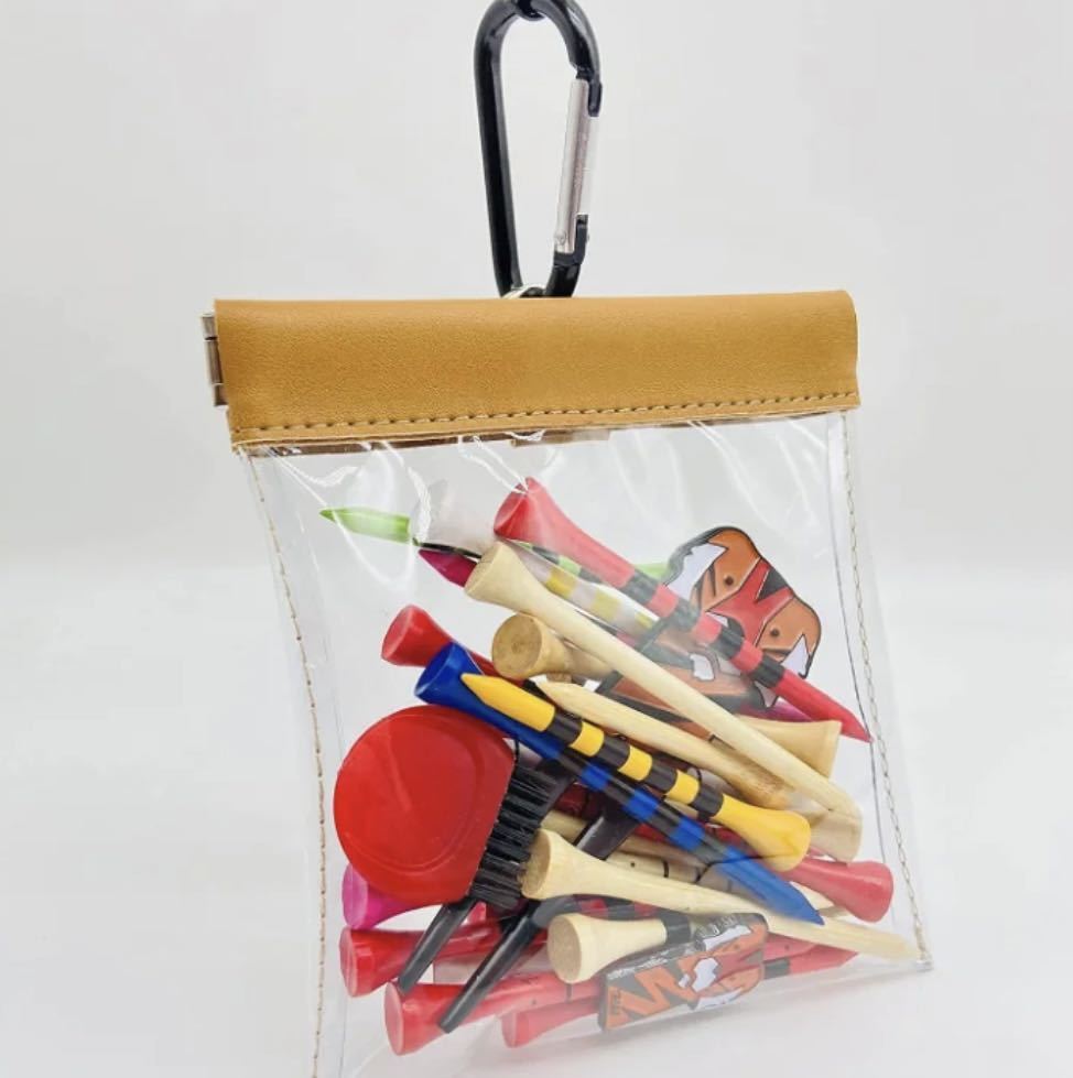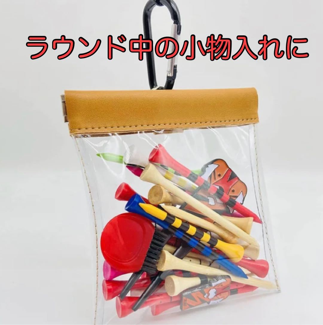 透明デザインと便利なカラビナが特徴のゴルフ用小物収納ポーチ。