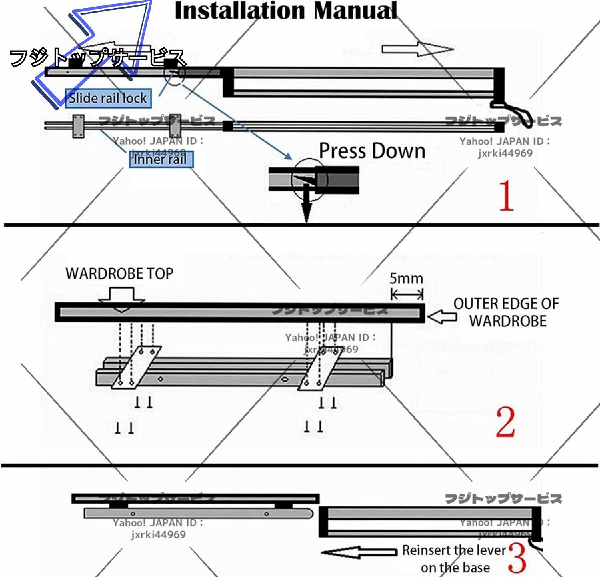 【取り付け簡単】: ワードローブロッドを正しい位置に置いた後、レールを引き出して取り外し、ワードローブのベースをネジで固定し、レールを揃えて本体に戻して取り付けを完了します。