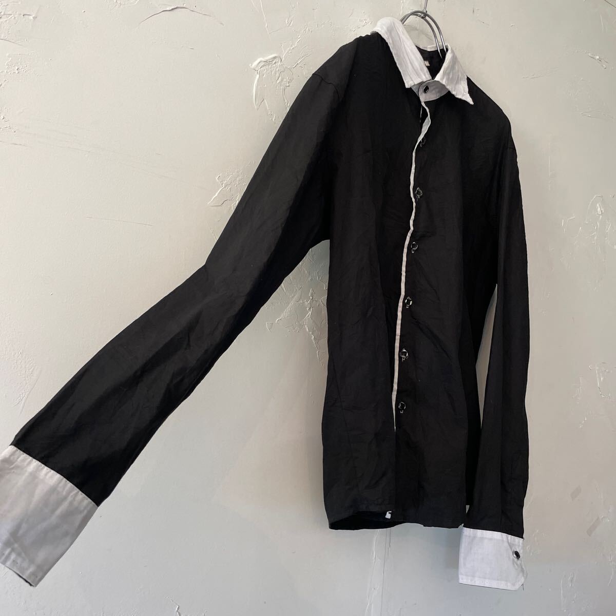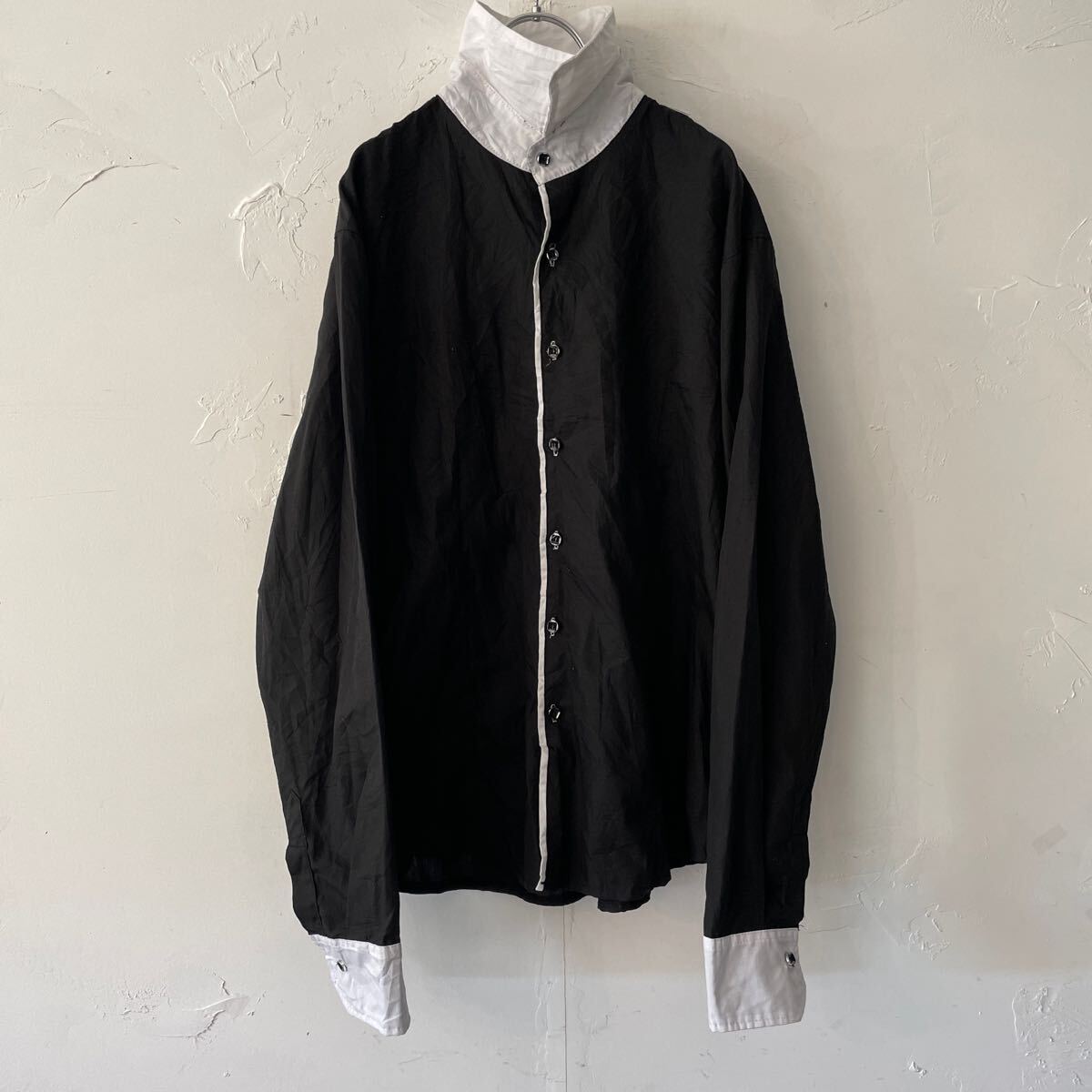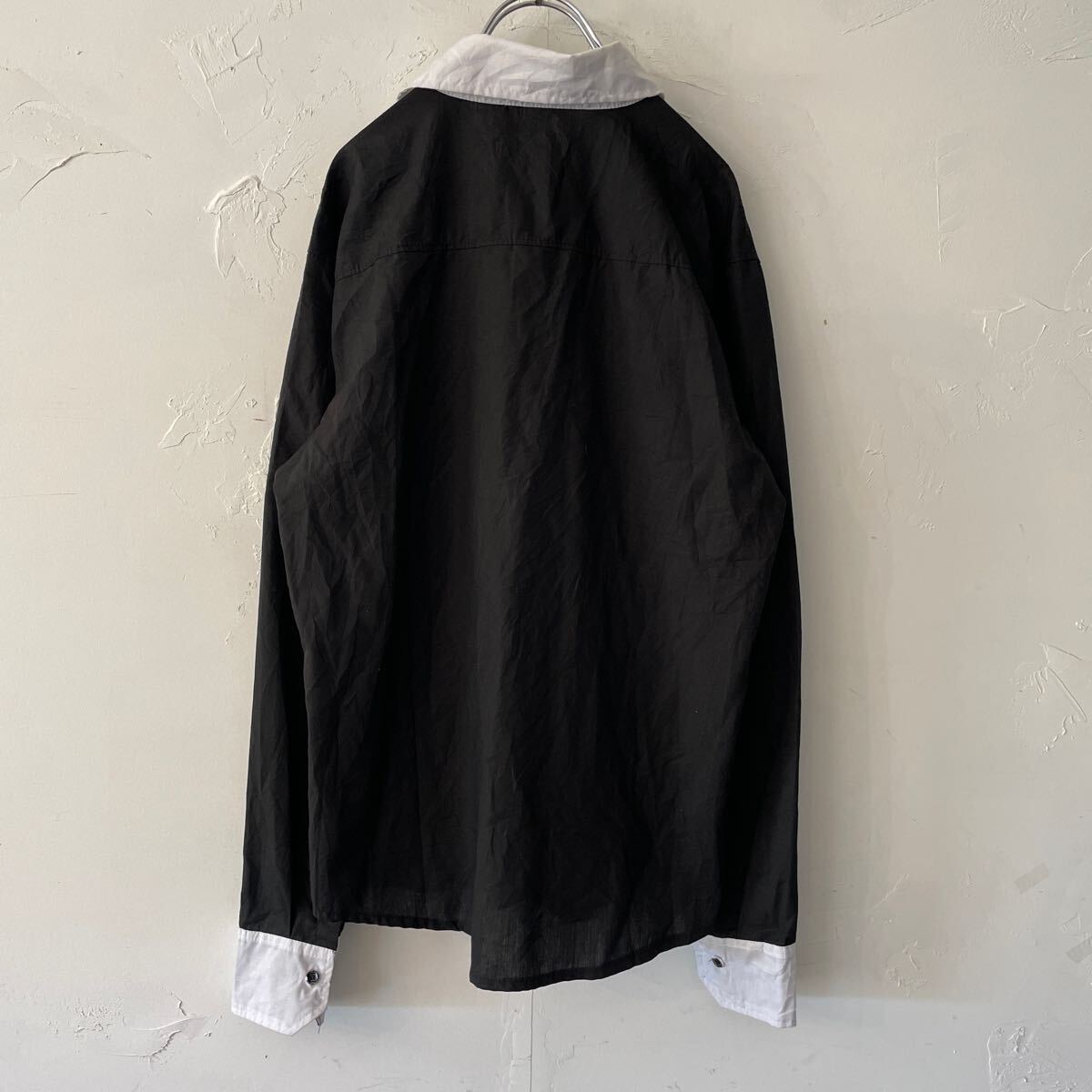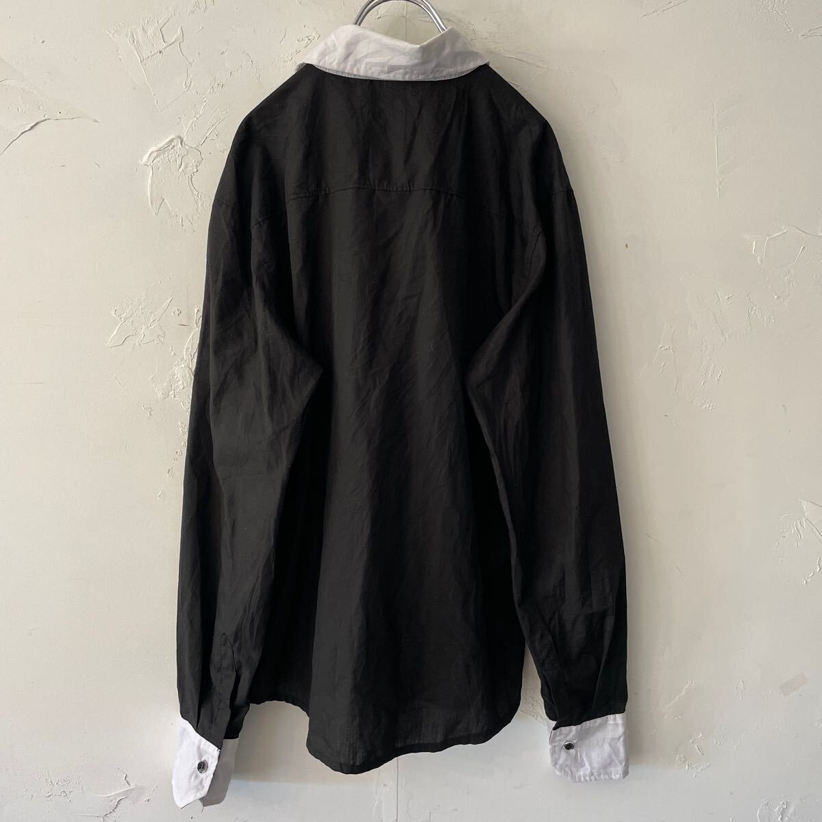 コットン生地 薄手の長袖ドレスシャツになります。 全体ブラック。襟と前立てらいん白色。メンズL。