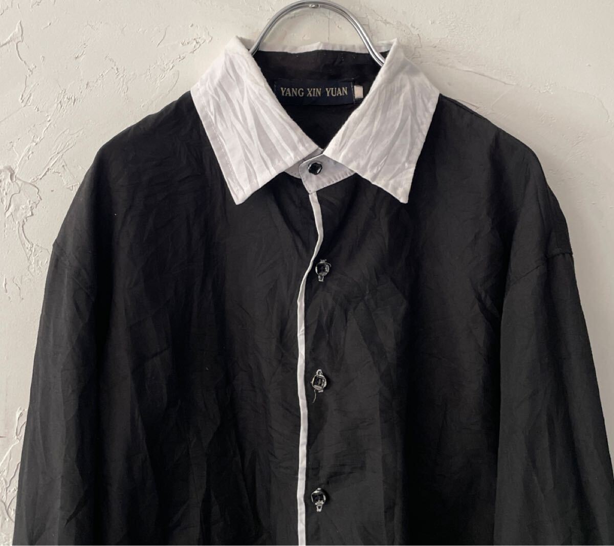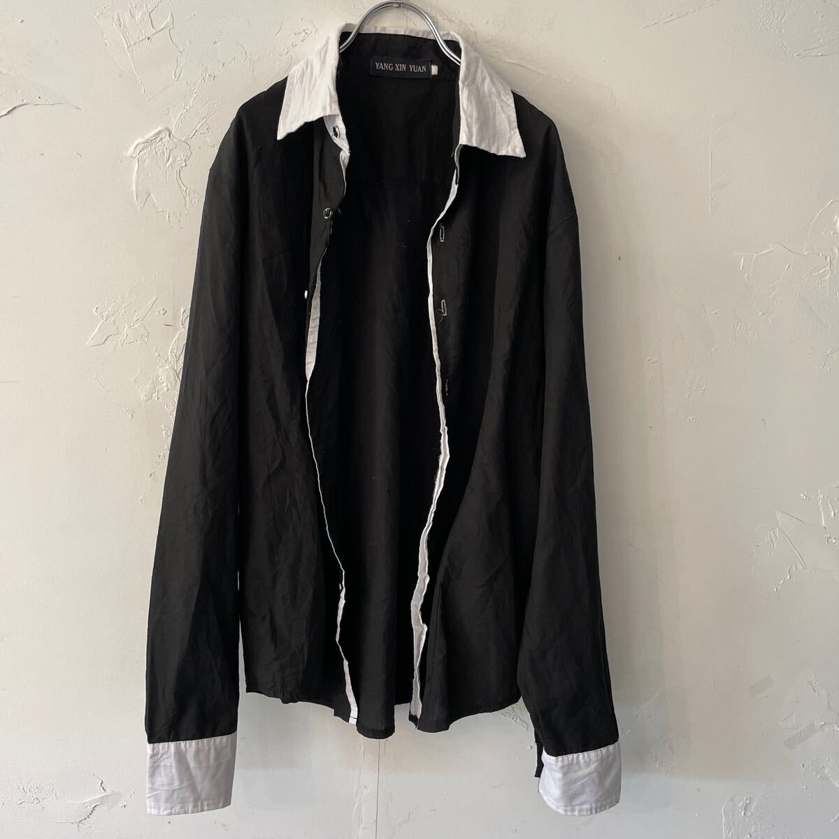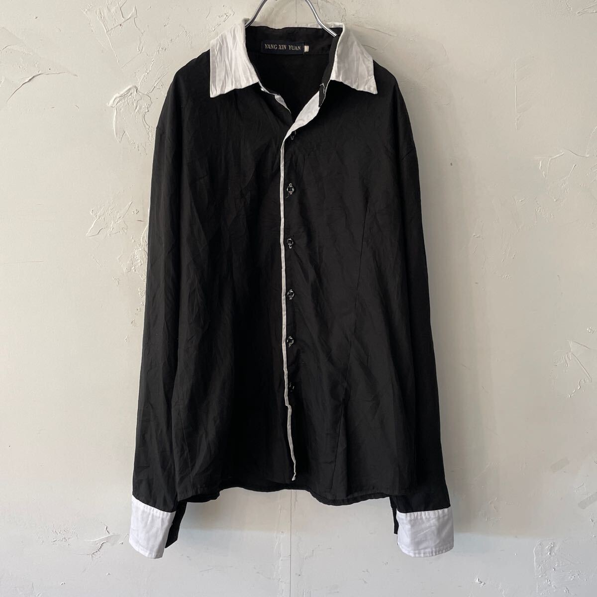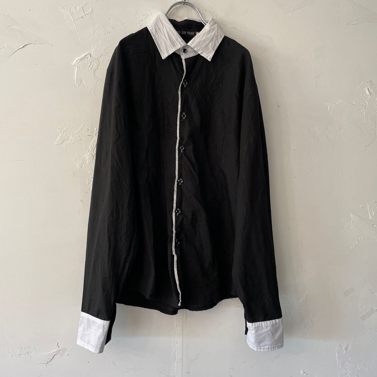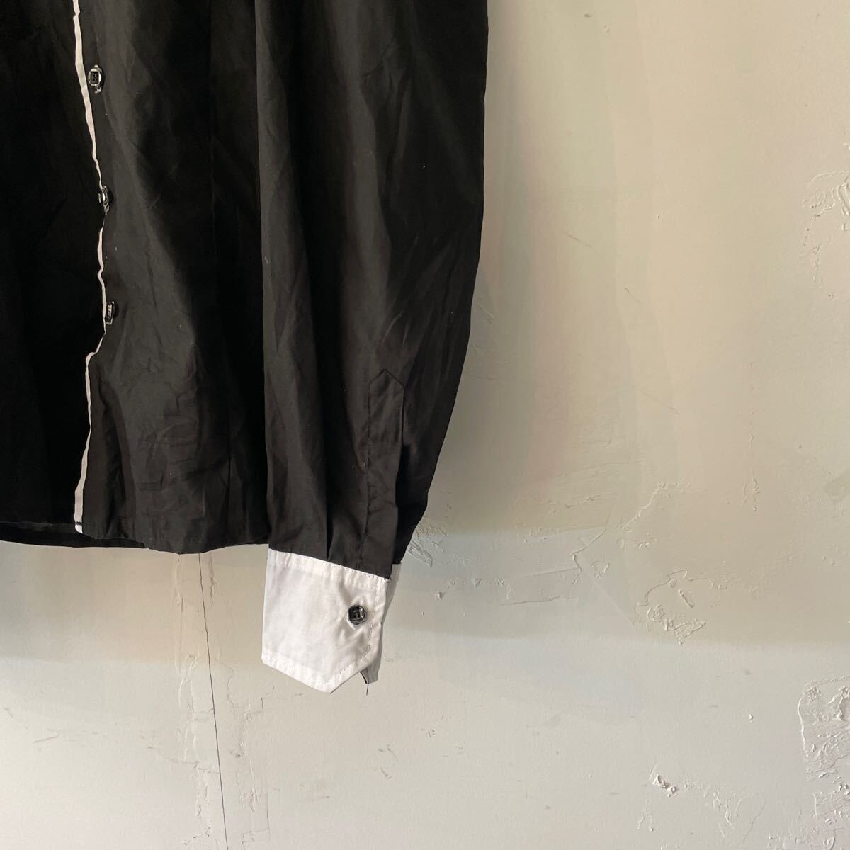 コットン生地 薄手の長袖ドレスシャツになります。 全体ブラック。襟と前立てらいん白色。メンズL。