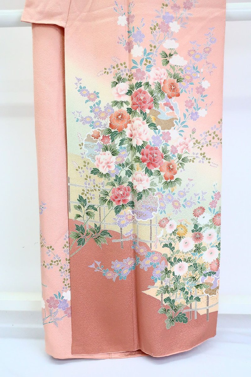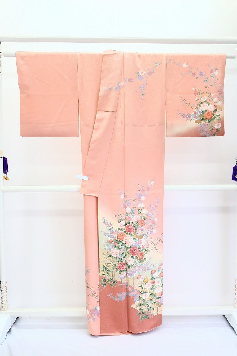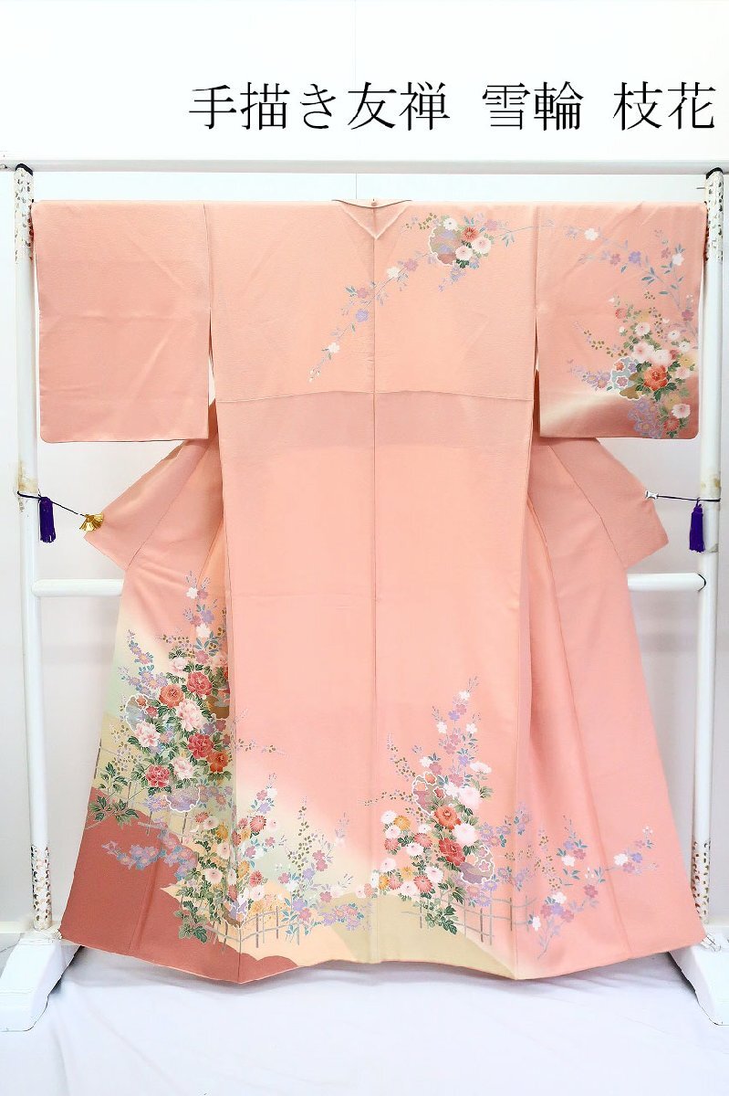 【送料無料】未使用品 訪問着 手描き友禅 京友禅 薄桃色 雪輪 菊 牡丹 身丈160cm 裄丈69.0cm 着物 仕立て上がり 正絹 着物フィ m-8228 |
