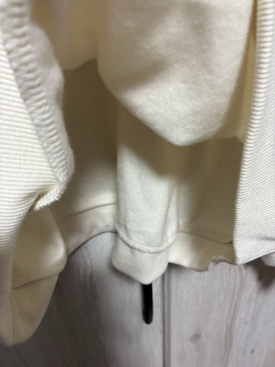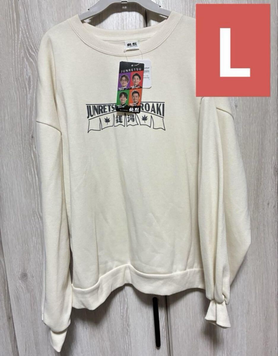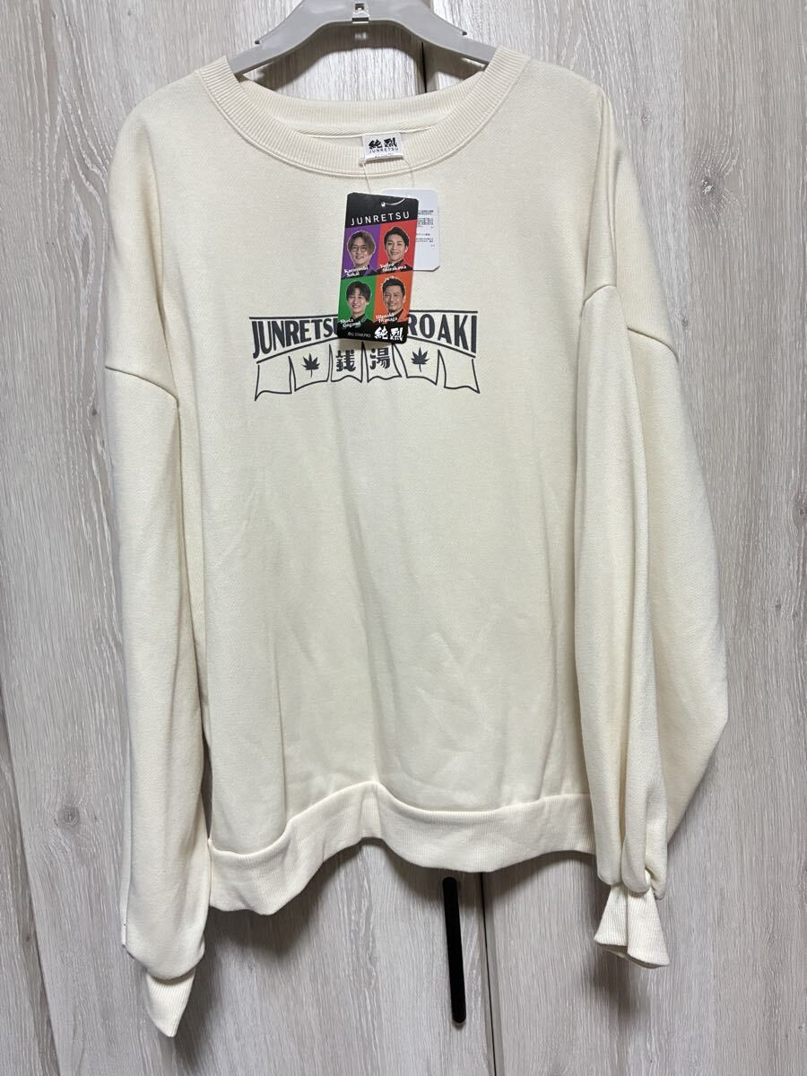 アイボリーのJUNRETSUトレーナー、ポリエステルと綿の混合素材で快適な着心地。