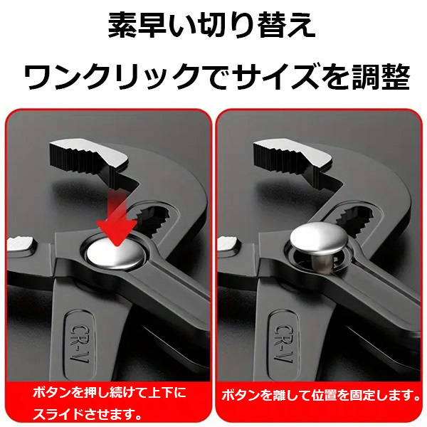 商品詳細 | 特長 V型多歯クランプ溝 丸パイプ、六角形、四角形、平面など、さまざまな形状の対象物をしっかりと掴むことができます。滑り止め設計で高い作業性を実現します。 簡単サイズ調整 ワンプッシュでサイズ調整が可能!ボタンを押しながらスライドさせ、手を離すだけで位置が固定されます。スムーズな切り替えで作業効率が向上します。 耐久性のあるCR-V素材 強度に優れたCR-Vスチール(クロムバナジウム鋼)を使用。長期間使用しても変形や破損が起こりにくい信頼性の高い工具です。 コンパクトで取り回しやすい設計 全長180mmとコンパクトサイズで、狭い場所でも扱いやすい設計です。一人での作業はもちろん、両手での使用にも適しています。 用途 配管作業、整備作業、DIYなど幅広い用途で活躍します。 丸パイプやボルト、ナットの締緩作業に最適! ■商品仕様 ・サイズ:全長240mm(10インチ) ・最大口幅:片手使用時30mm ・素 材:CR-Vスチール ・特 徴:プッシュボタン式、V型クランプ溝 |
