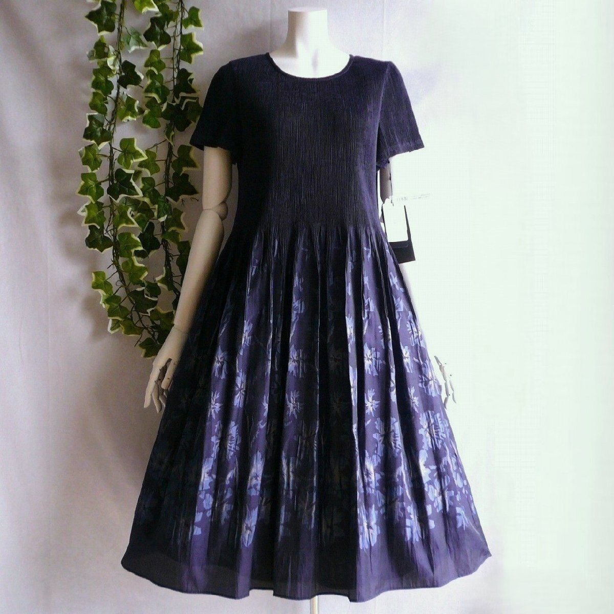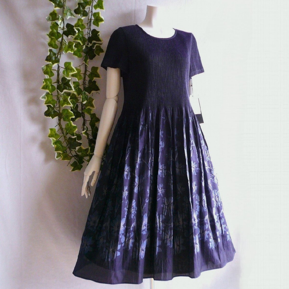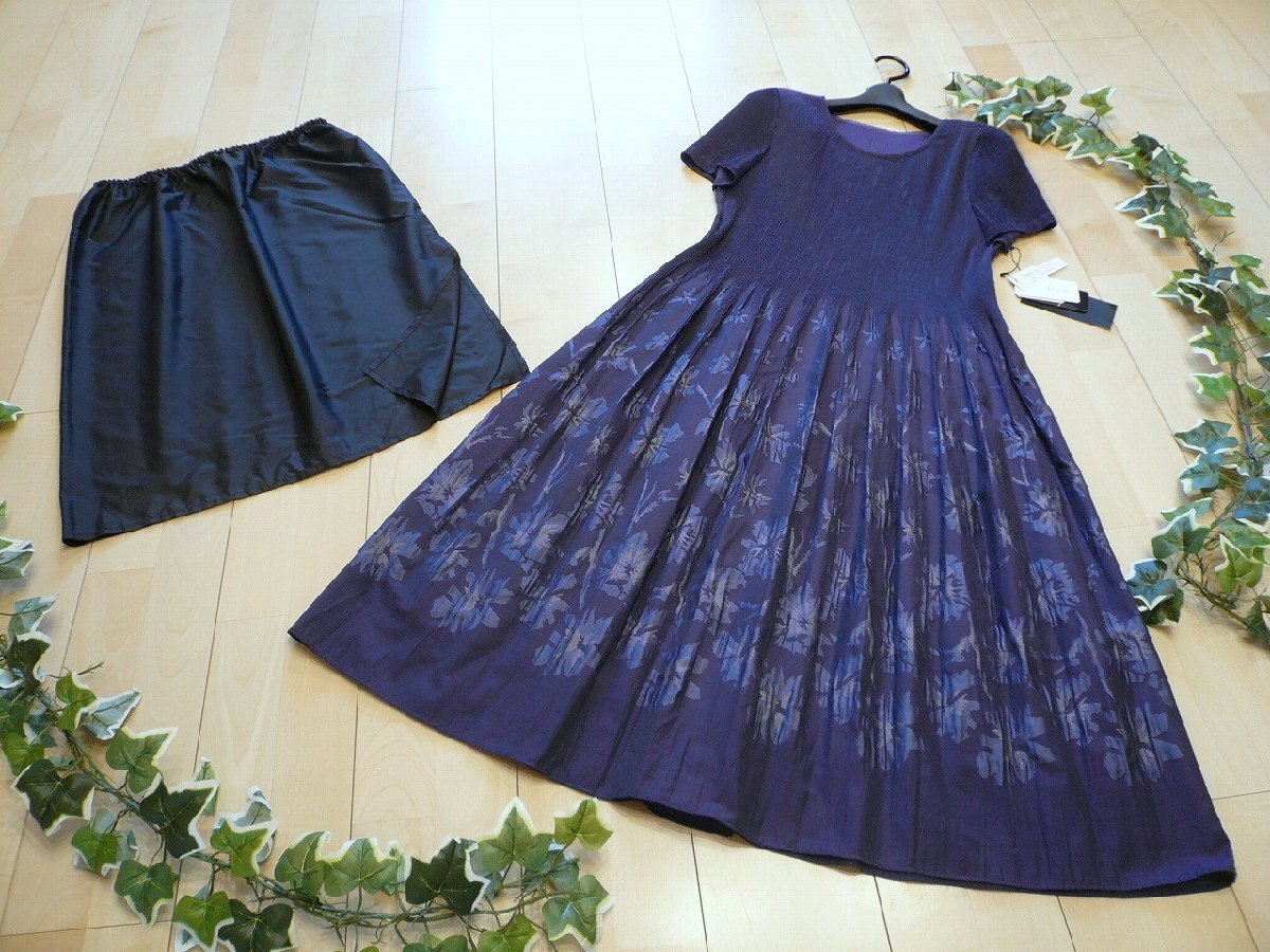 新品 9713 L 日本製 桐生織 プリーツ ワンピース 春 夏 秋 紫系 レディース 綿混 抑揚花模様 ペチコート付 高級 上質 上品 50代 60代 70代